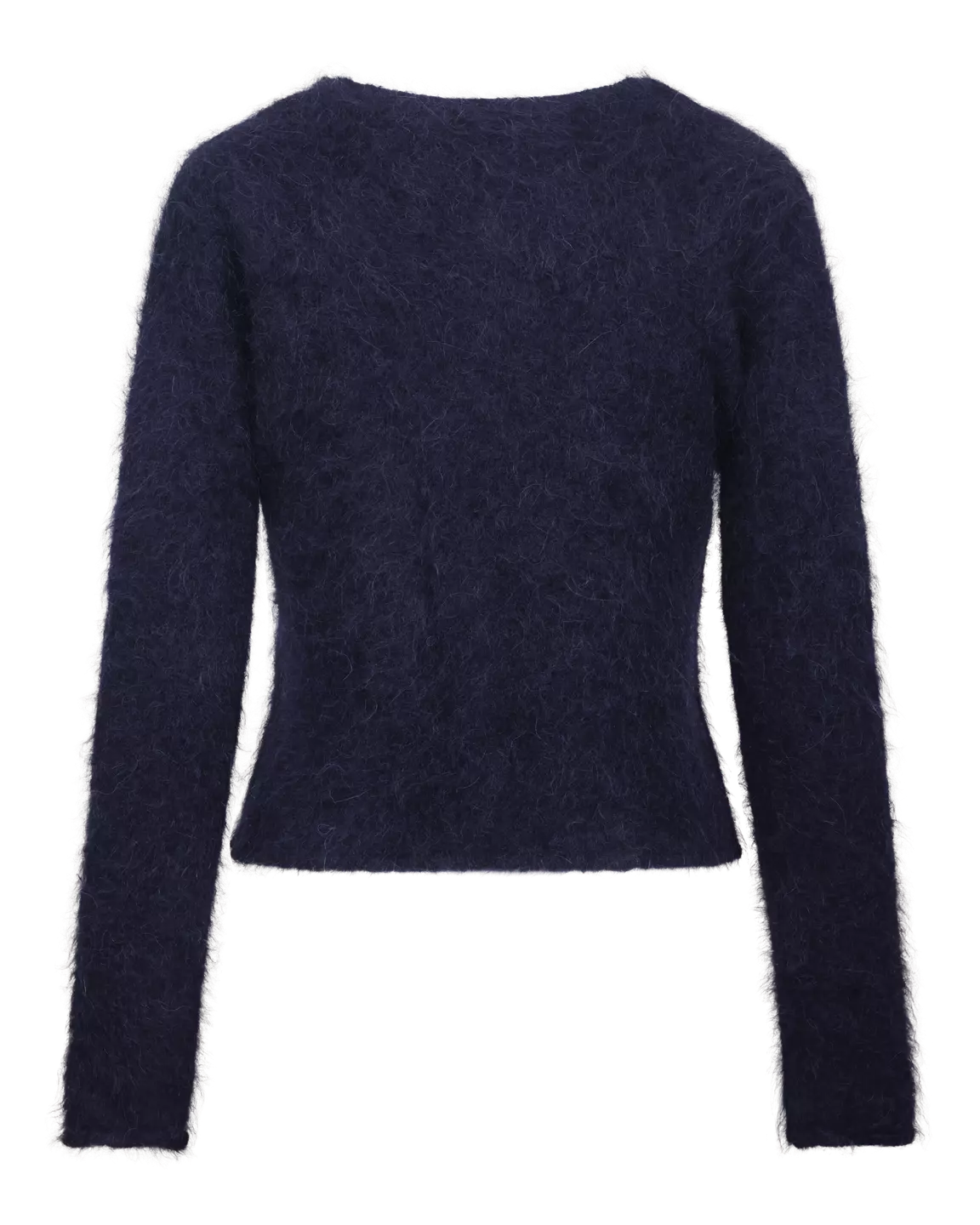 En pusete og fantastisk god strikket cardigan i en sååå fin dyp blå. Med rund krage og en skjønn perle-lignende knappeløsning foran.