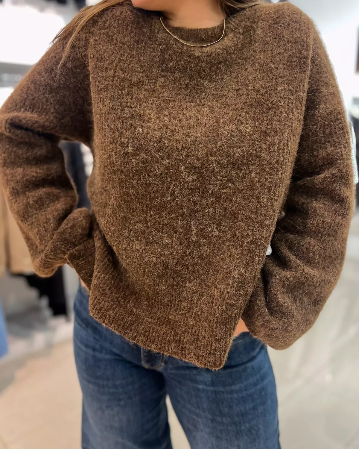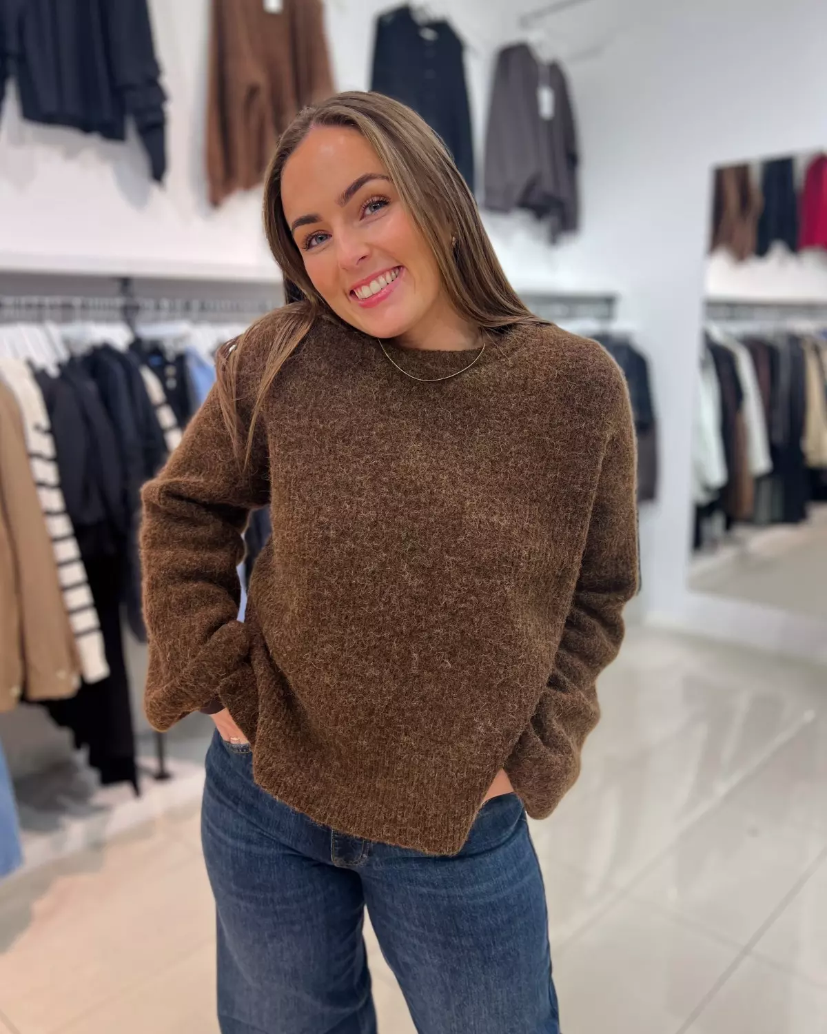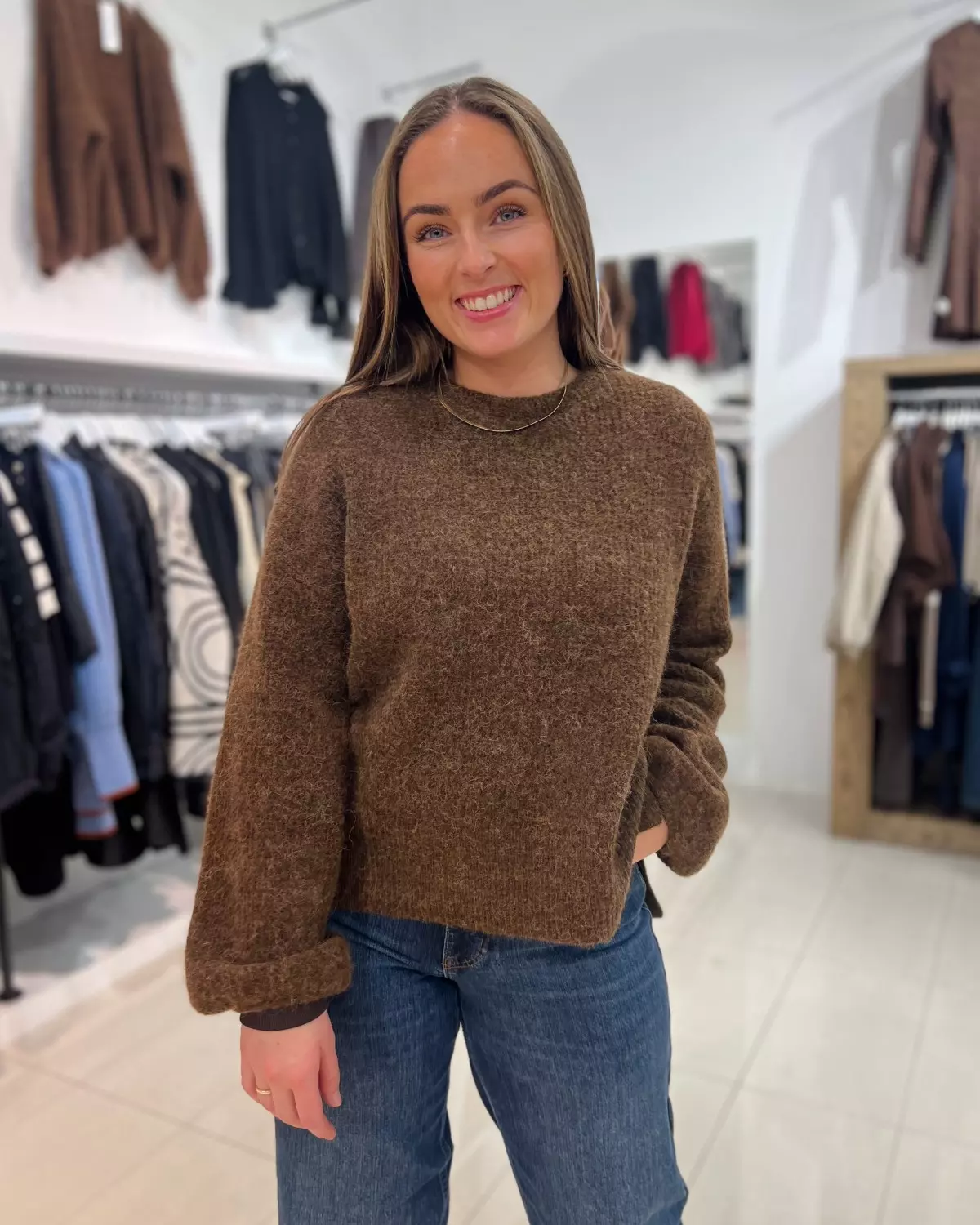 Fineste strikkegenseren i en nydelig brunfarge som passer perfekt inn mot høsten!