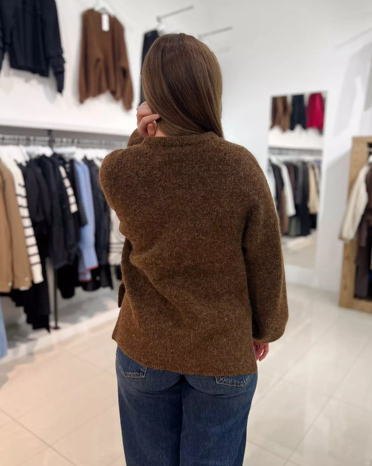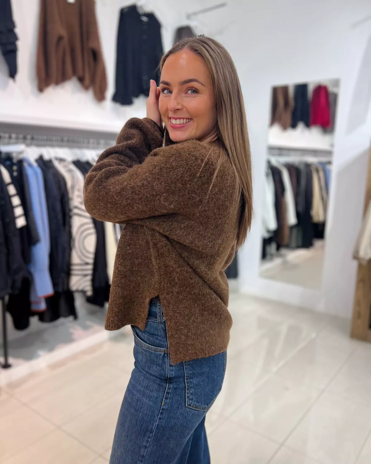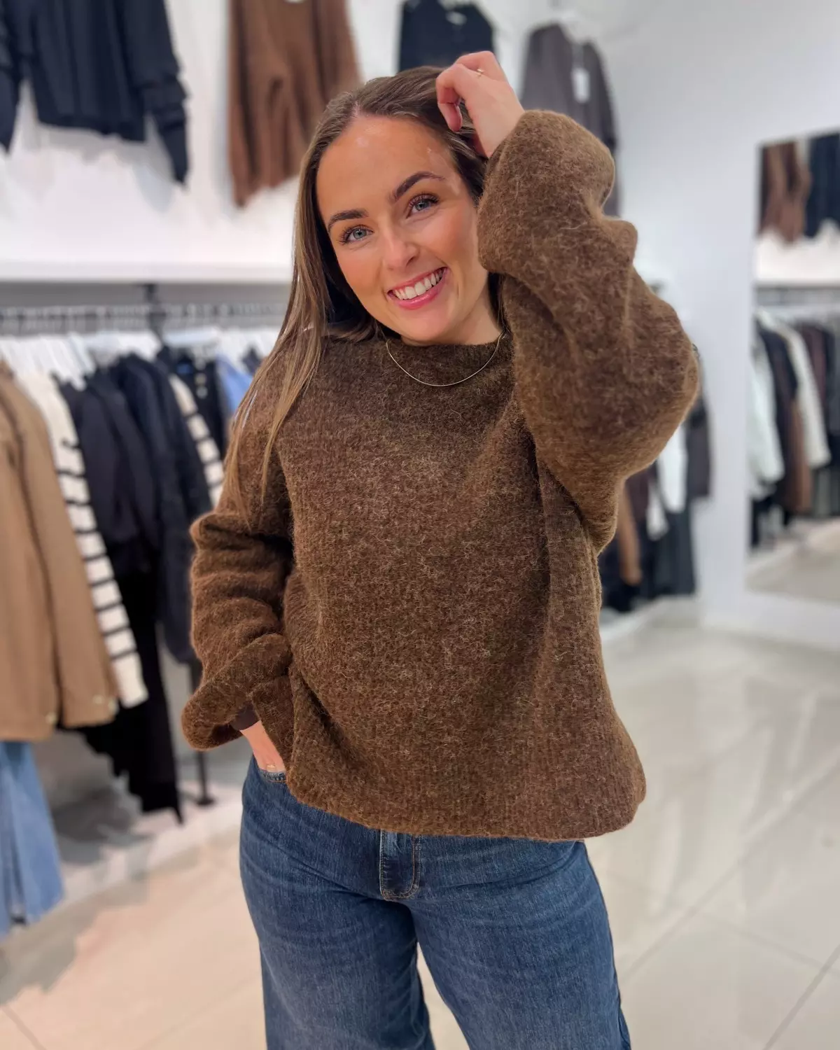 Fineste strikkegenseren i en nydelig brunfarge som passer perfekt inn mot høsten!