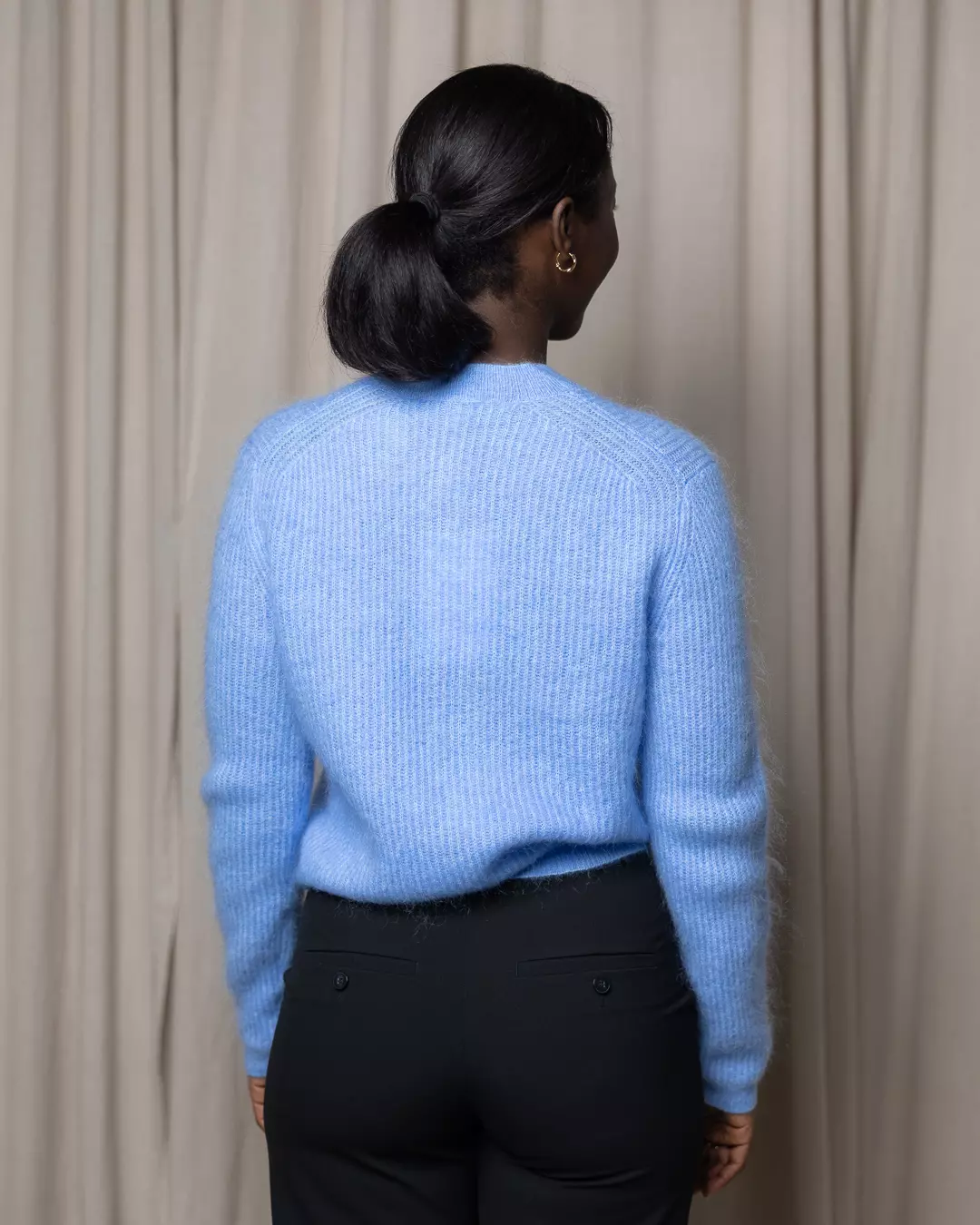 Laget av: 32% mohair, 34% ull, 27% polyamide og 5% elastan.