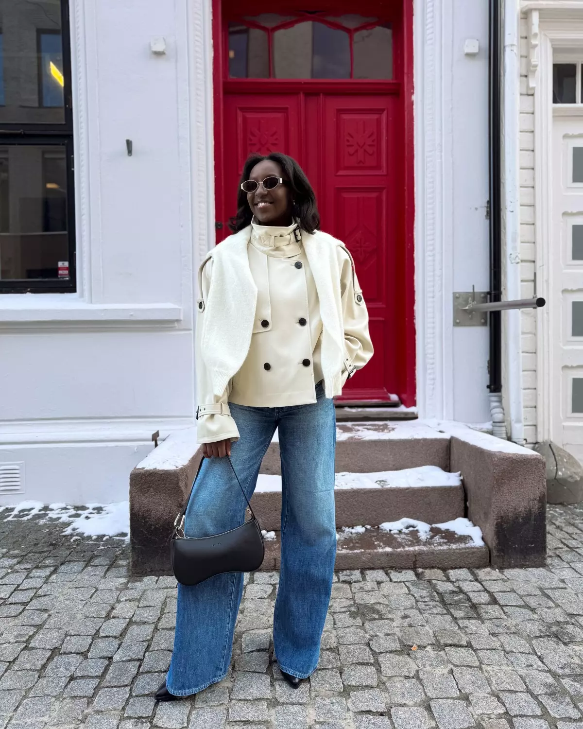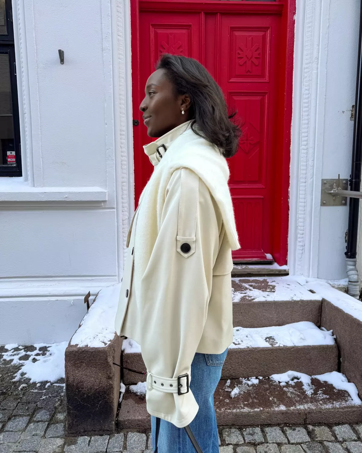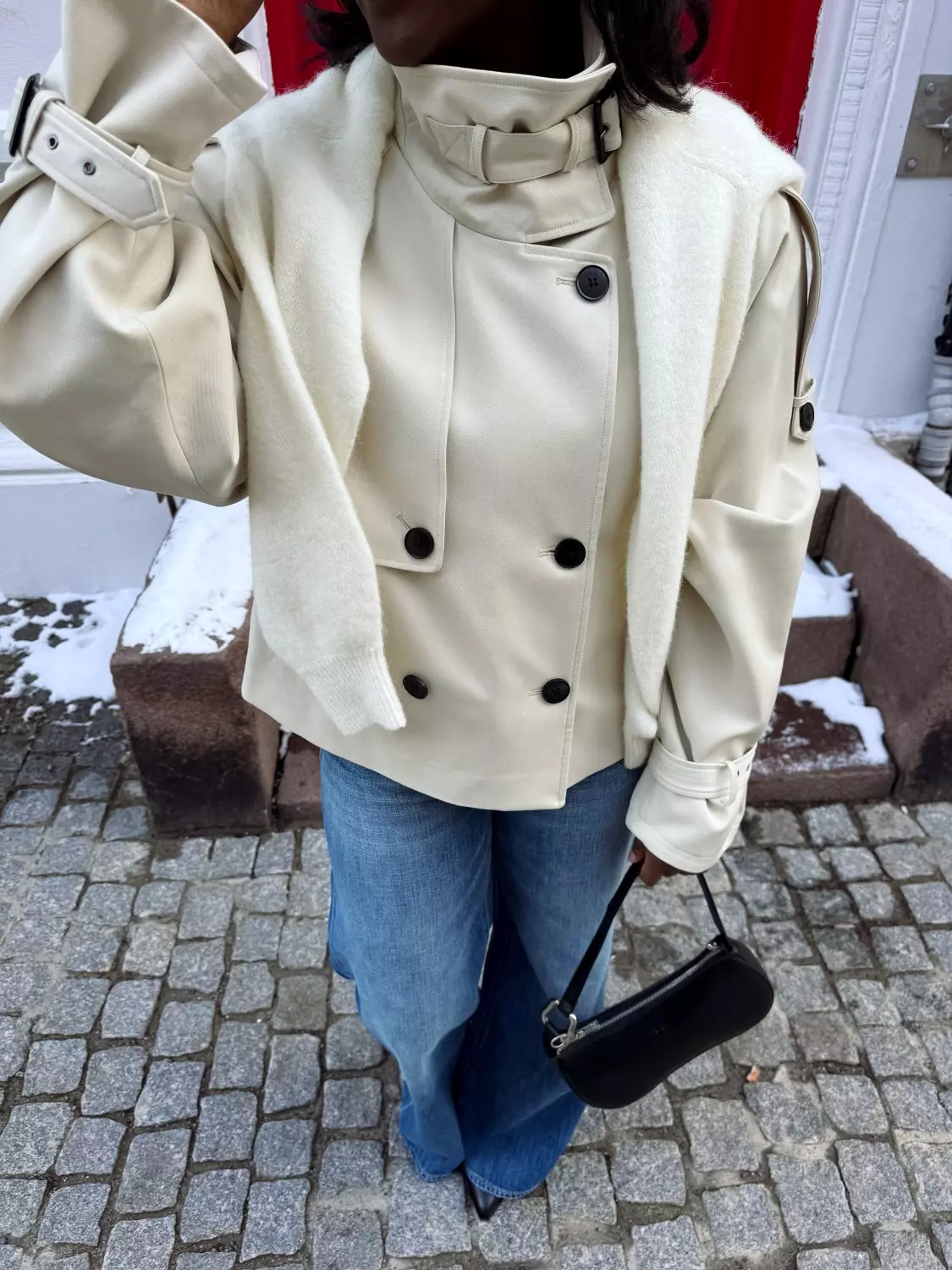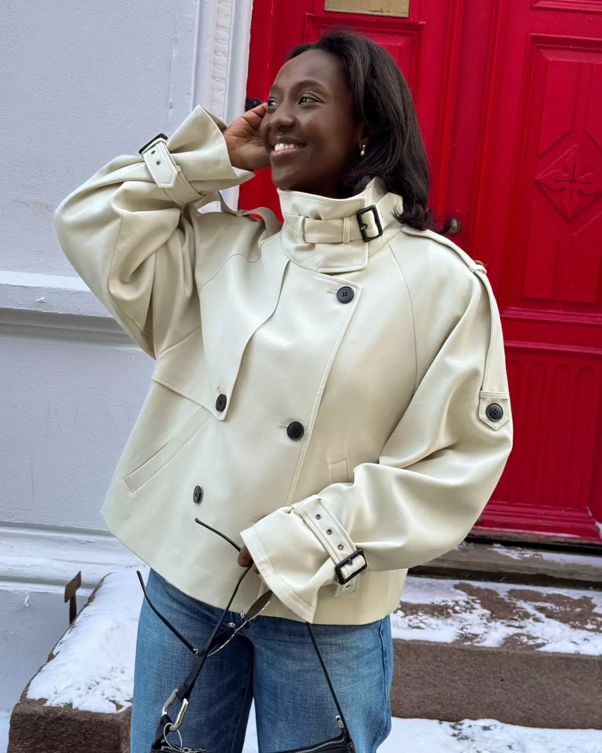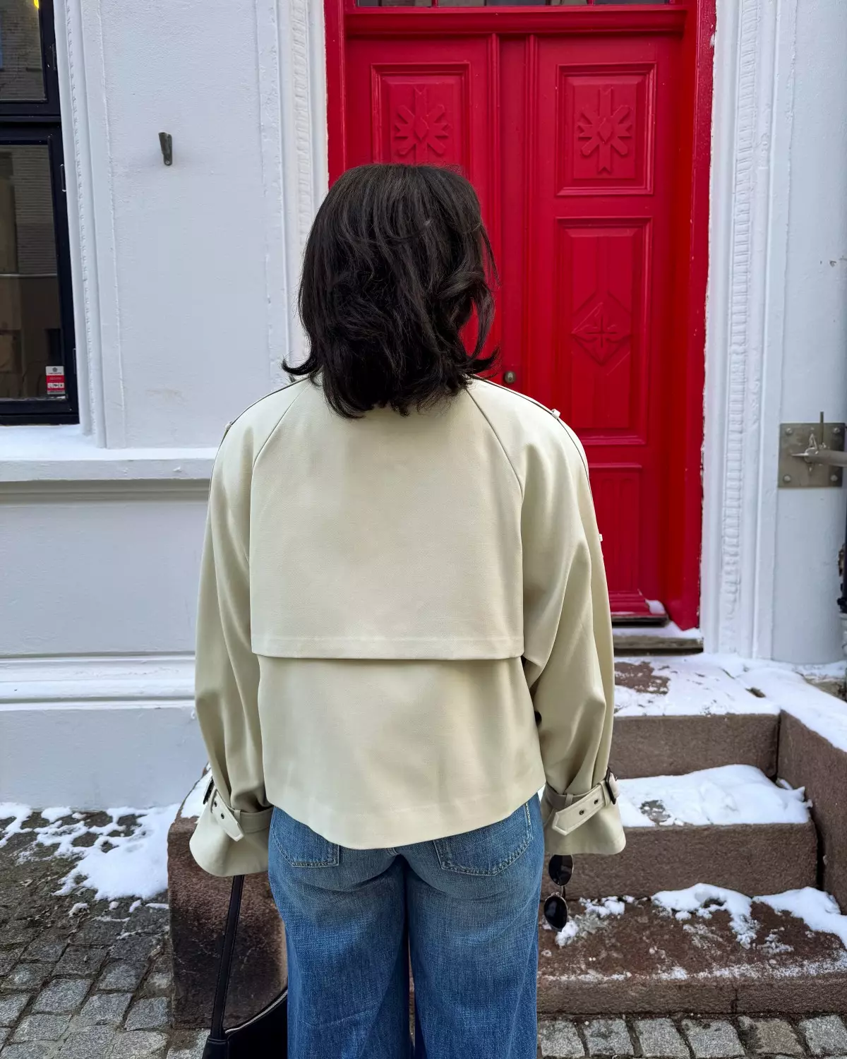 Kort jakke med strukturert passform, høy krage med belte, dobbel knappelukking, raglanermer og justerbare spenner på mansjettene. Frontklaff og sidelommer gir et moderne uttrykk.