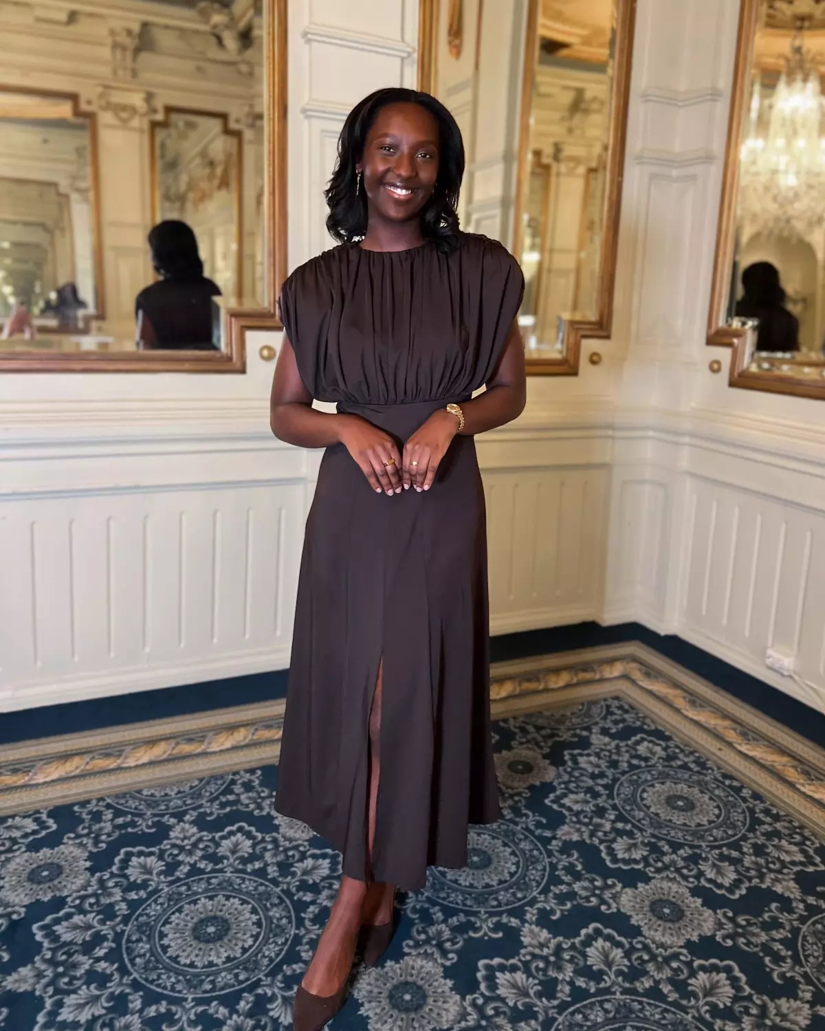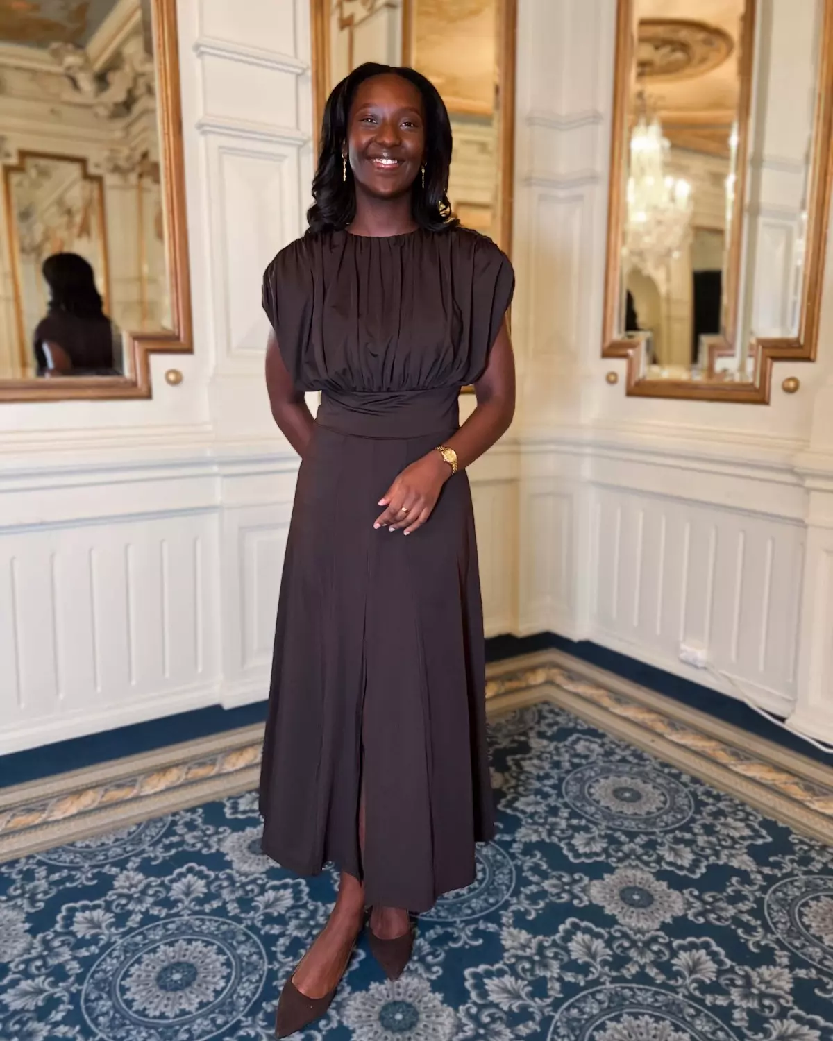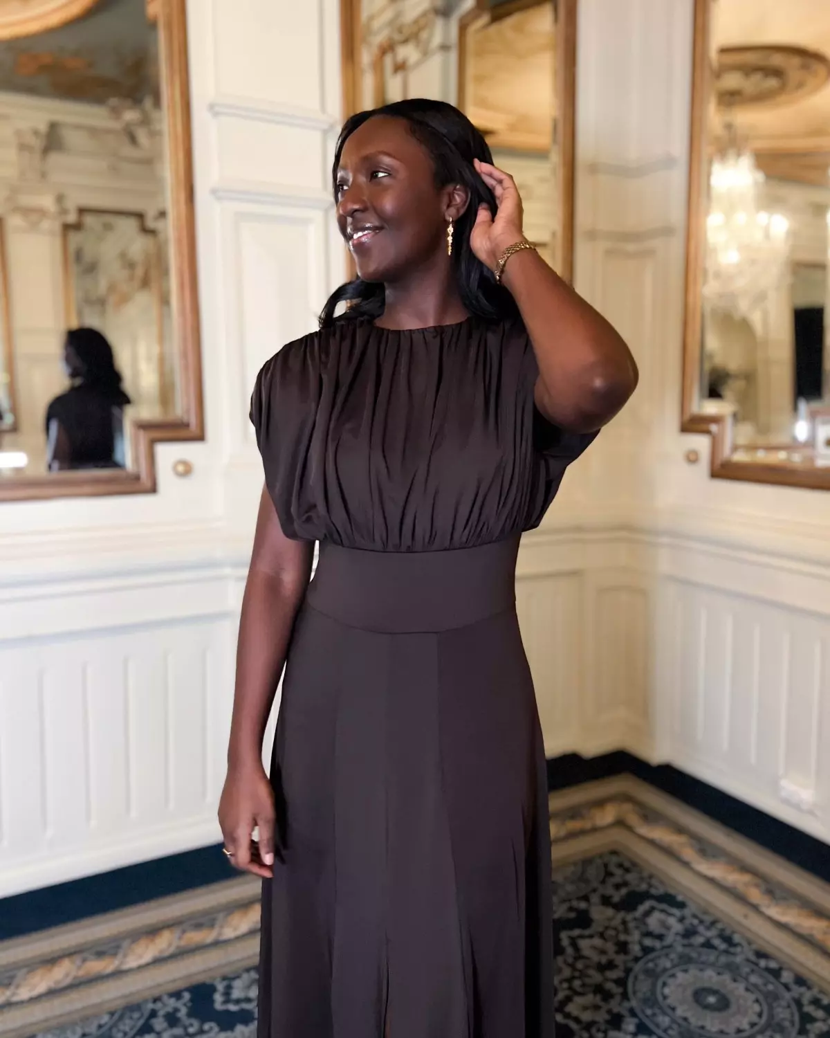 Dette er en elegant mørkebrun kjole med rund hals og vakre puffermer, en definert midje og et nydelig fallende skjørt. Det er en kjole som passer til flere anledninger, og spesielt til formelle og festlige sammenkomster.