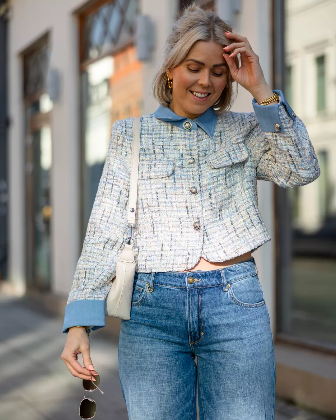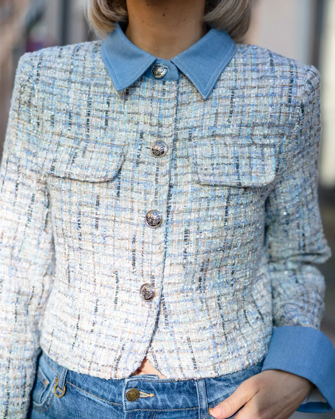 Celine er en klassisk jakke med nydelig fargespill! Hun glitrer i riktig lys, har flotte sølvfargede knapper og en kul denim krage som rocker den litt opp!