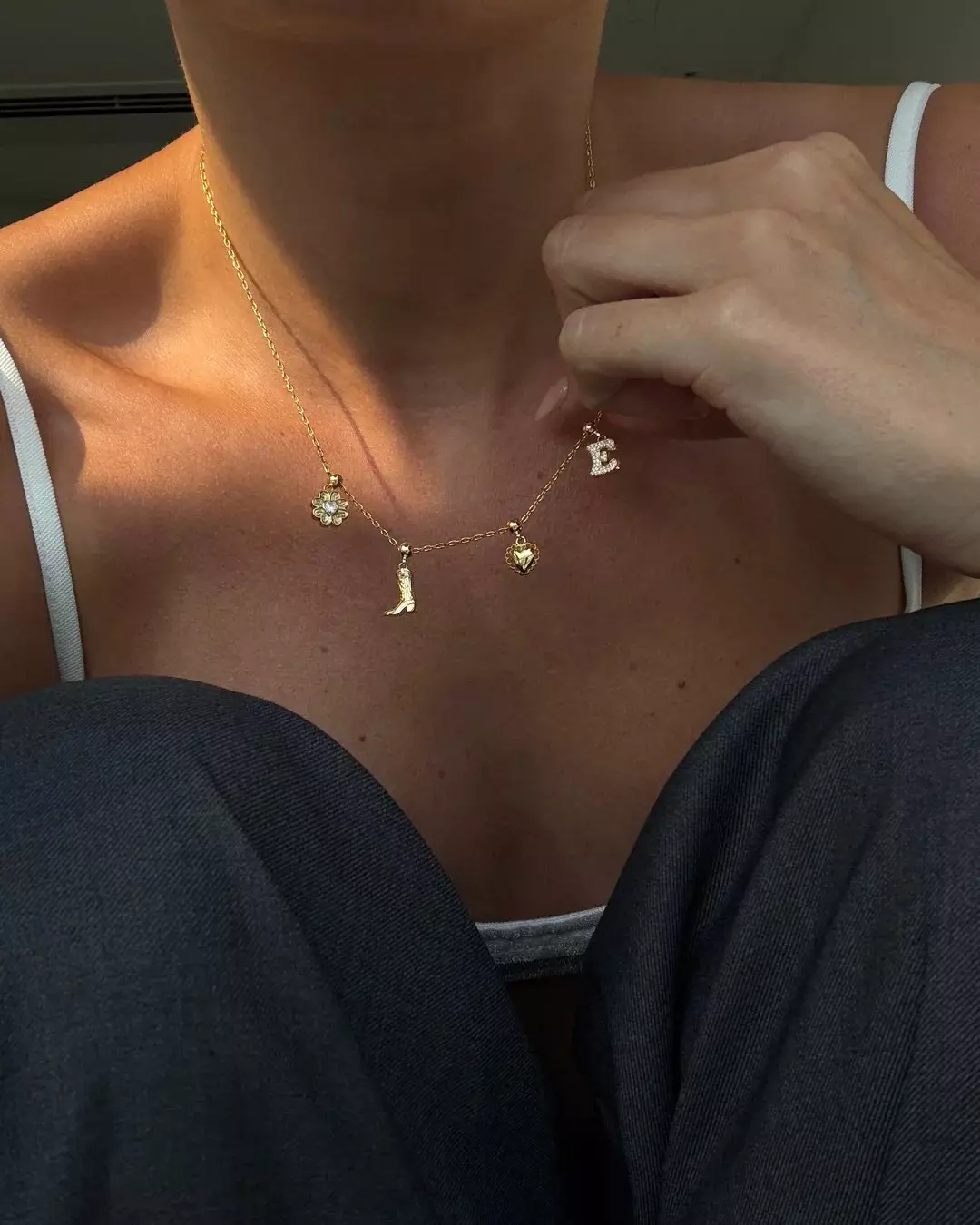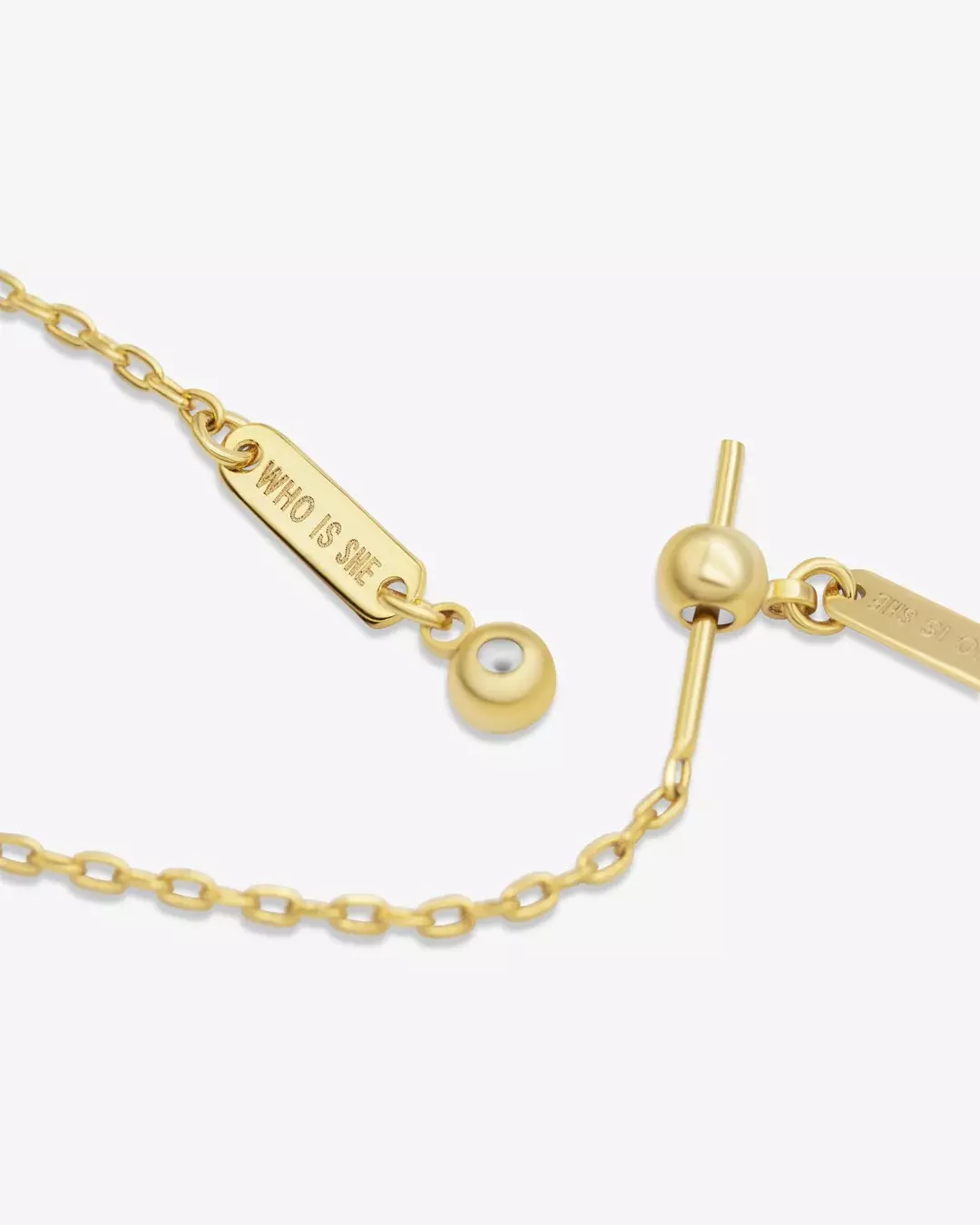 Alle charms fra Who Is She kommer i sølv- eller gullbelagt messing, og har en liten gummidel i festet som tres direkte inn på kjedet. Vi anbefaler å unngå vann, parfyme og fukt for å bevare både belegg og feste best mulig.