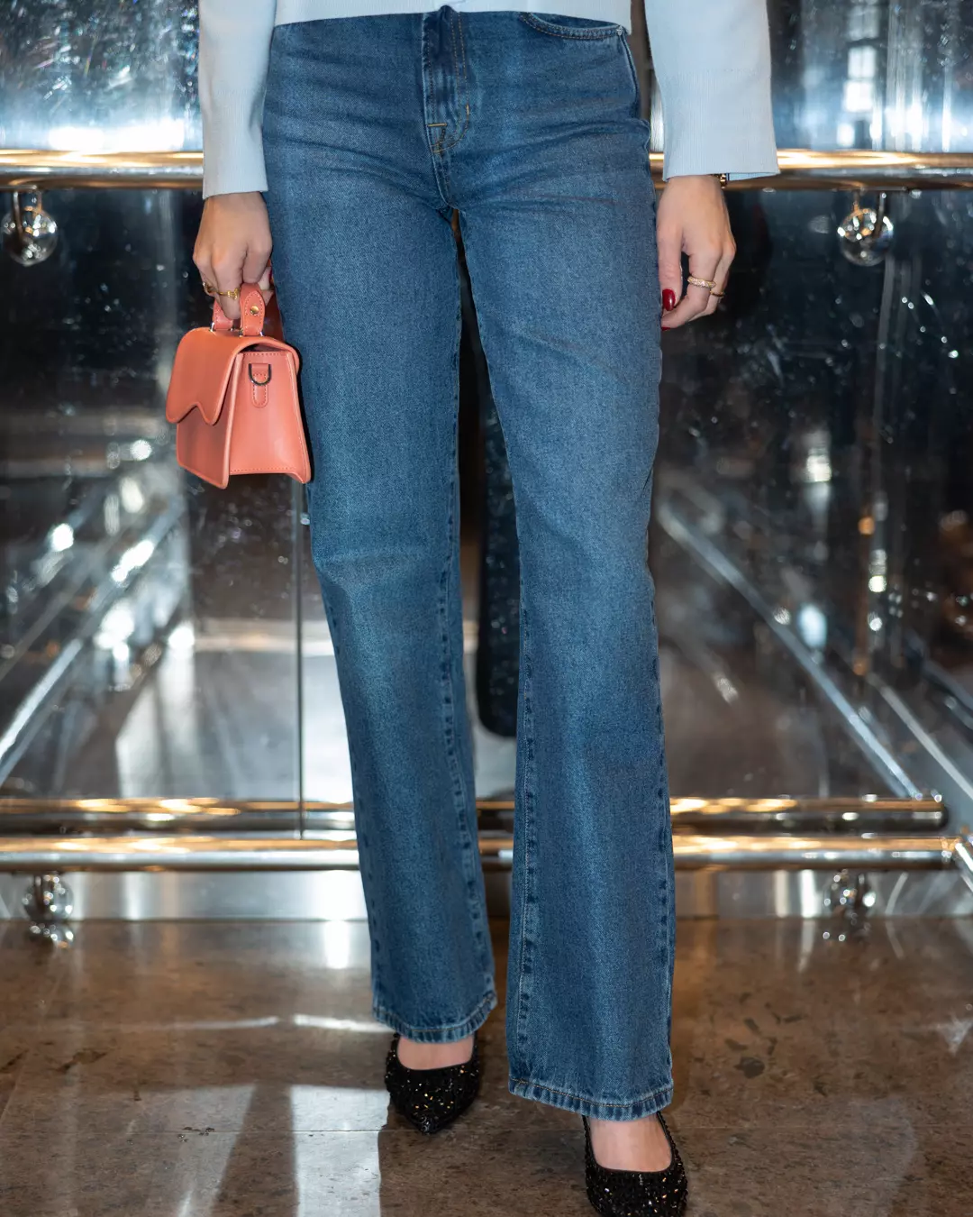 Vesken har magnetisk lukking og inneholder ett rom med en innvendig glidelåslomme. Vesken har et kort håndtak og en justerbar skulderreim.