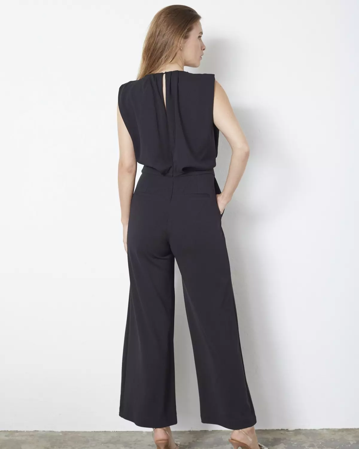 Denne jumpsuiten har vi ventet på! Nydelige vide bein, høy og smal i livet og stikklommer bak – så her får du både en feminin men samtidig tøff jumpsuit. Til både julebord, men kan også styles med for eksempel en blazer til jobb eller middag! Fremme på lår er det også en søm som gjør at presset holder seg.