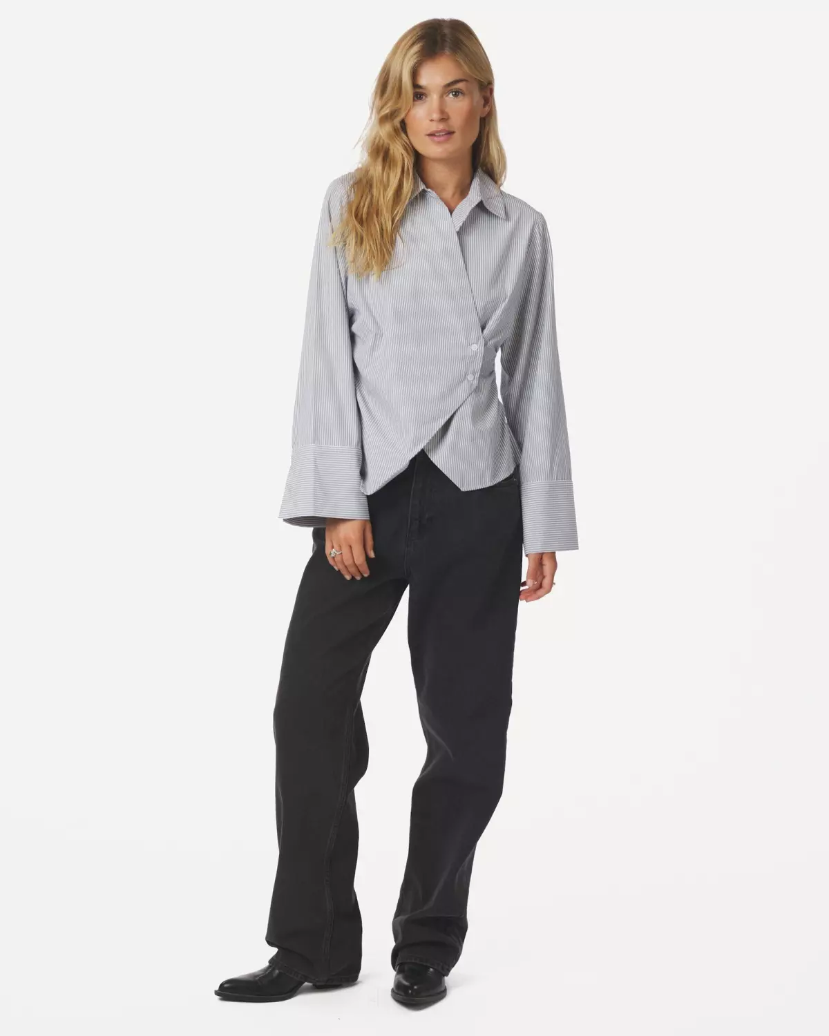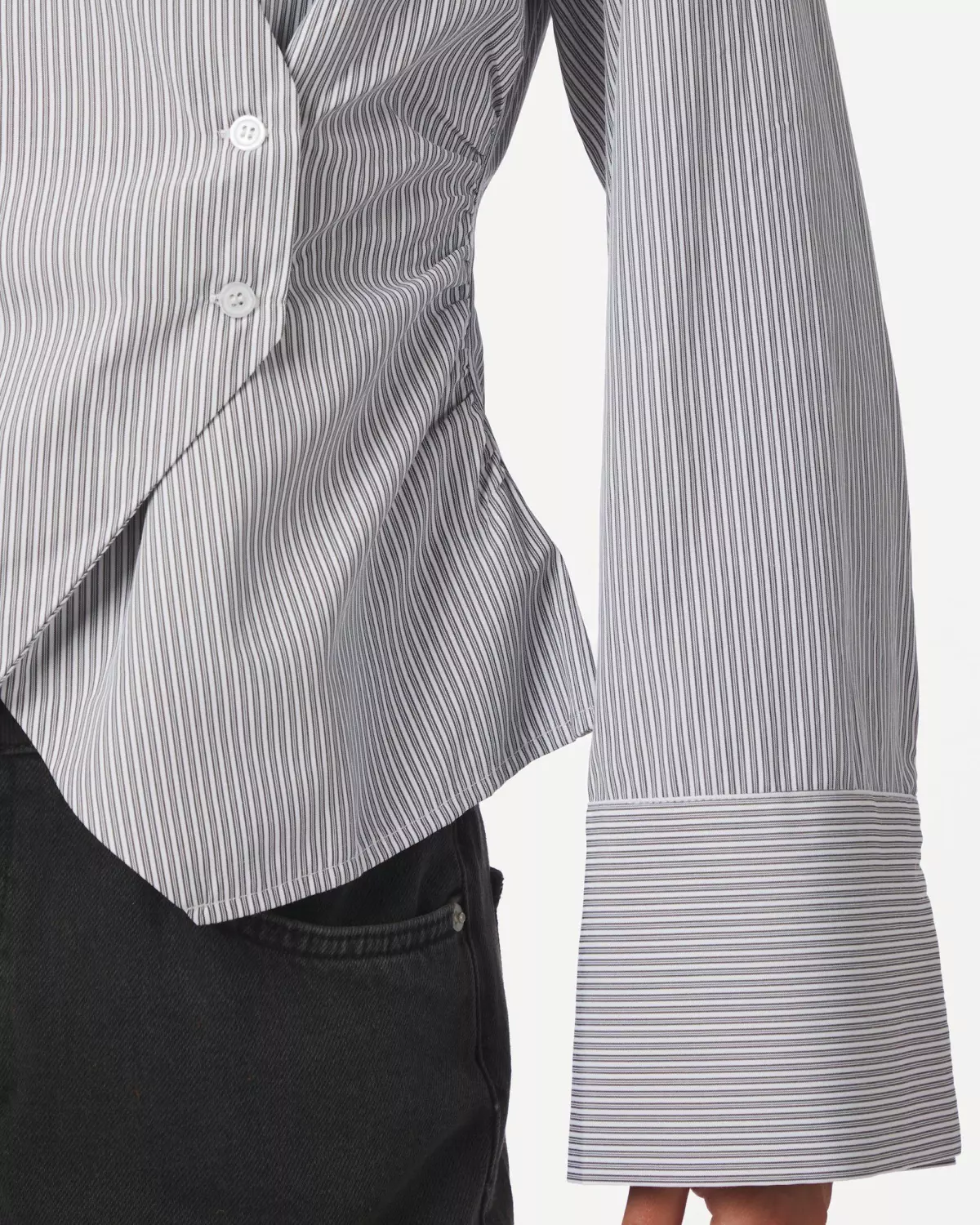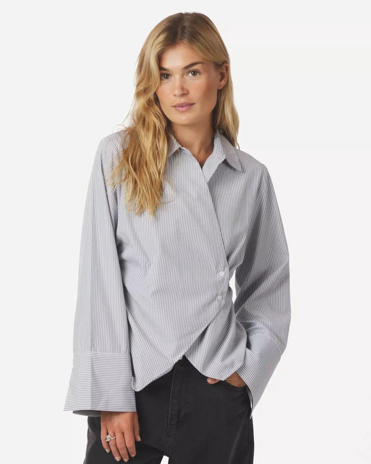 Super fin stripete skjorte med insnevring i midjen. Skjorten har omslagseffekt foran med knappelukking.