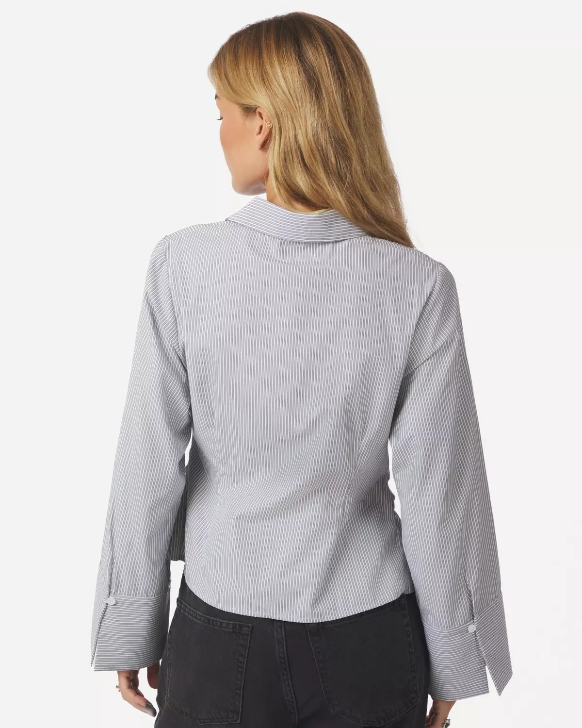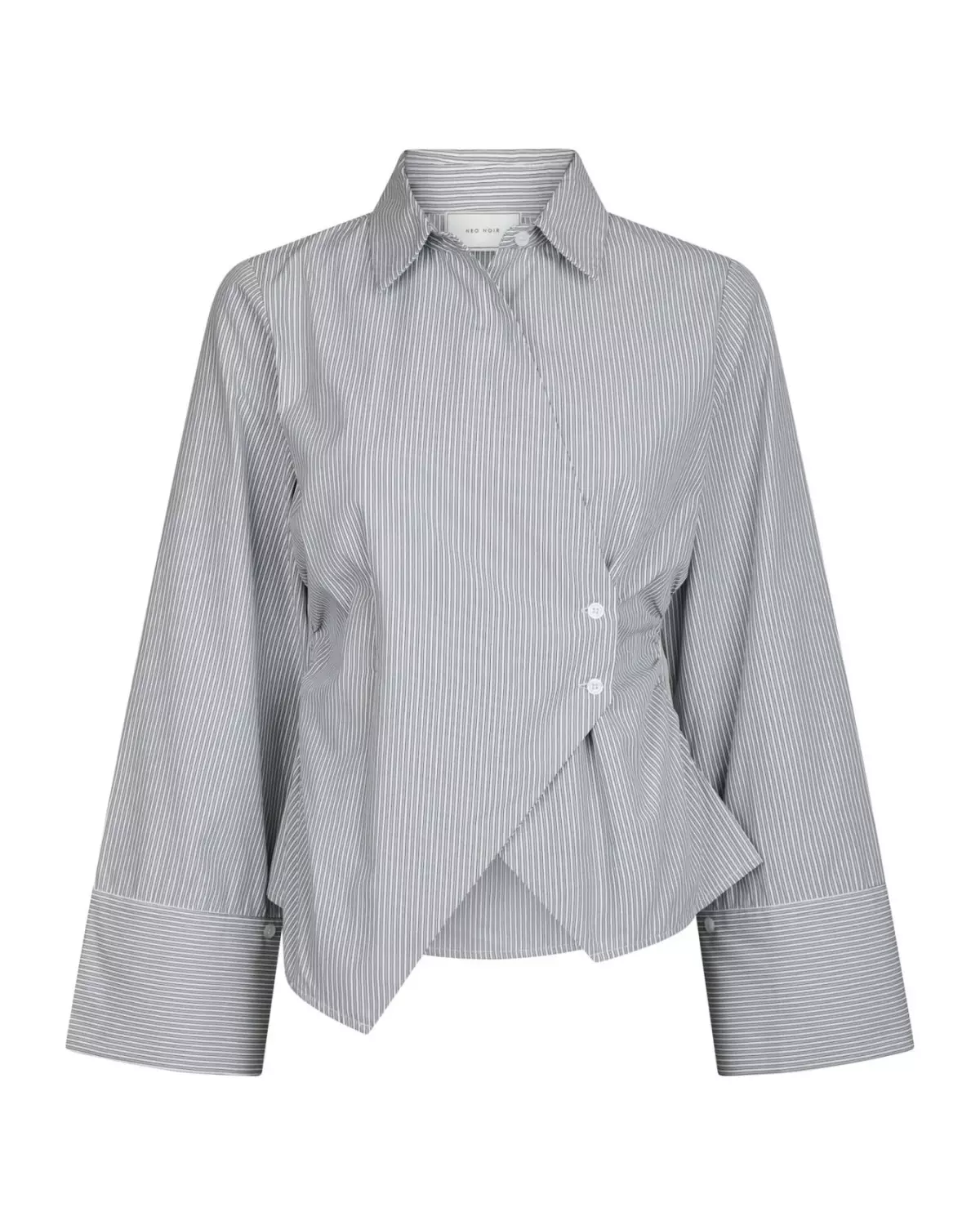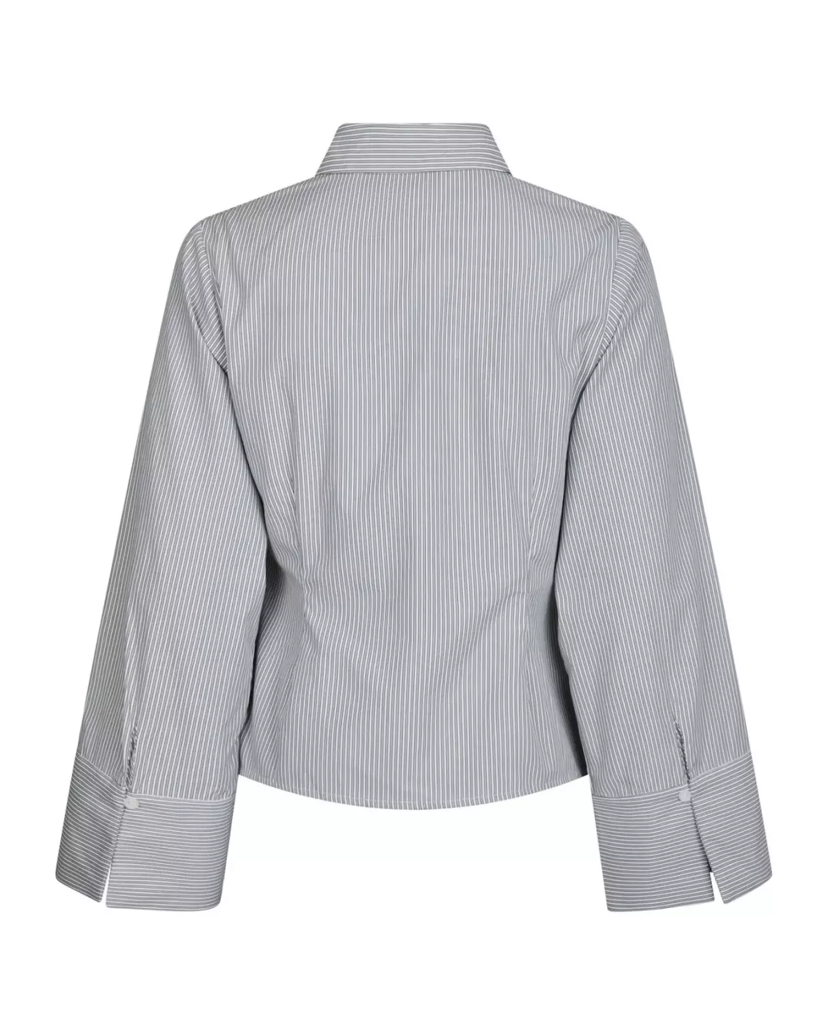 Super fin stripete skjorte med insnevring i midjen. Skjorten har omslagseffekt foran med knappelukking.