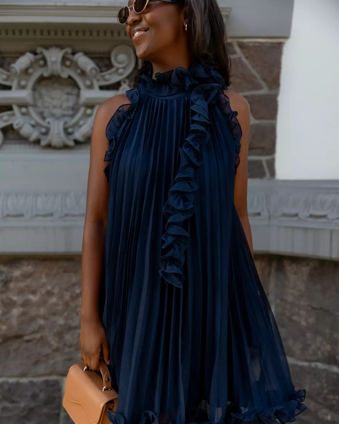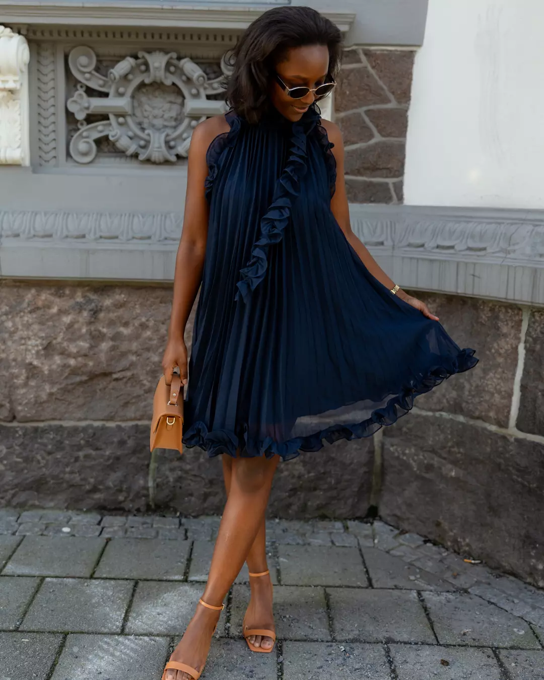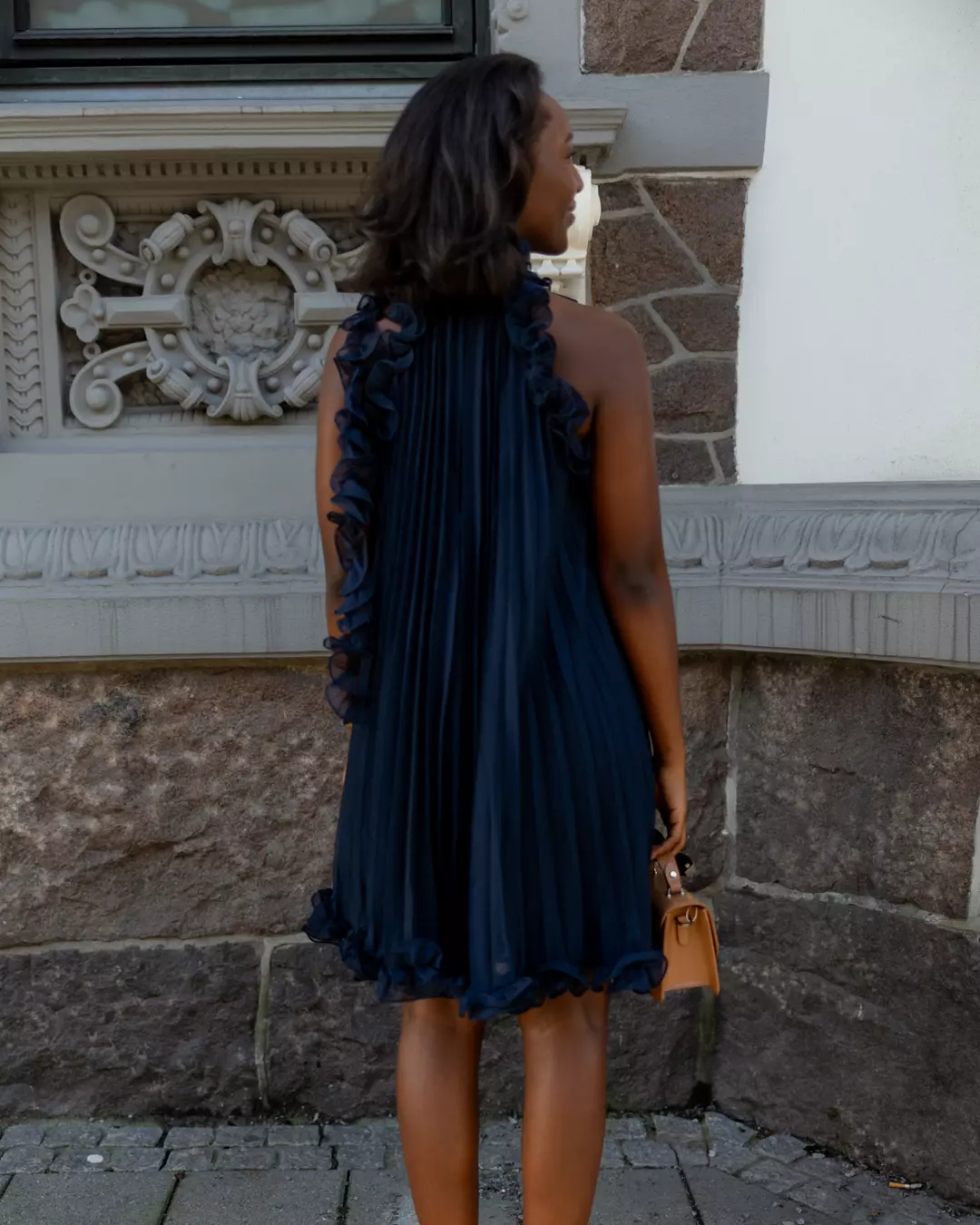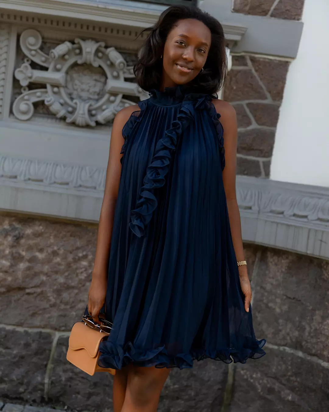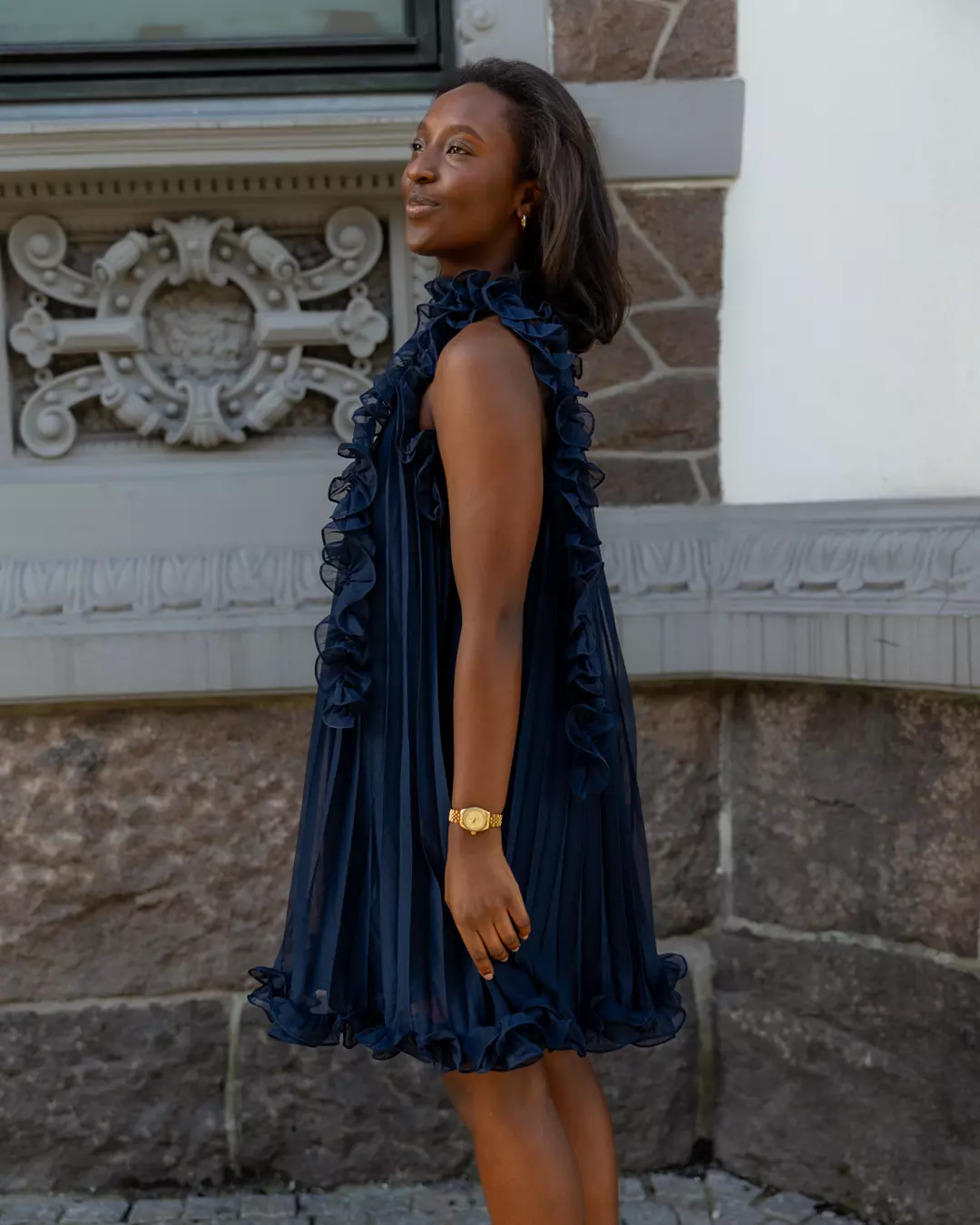 En plissert minikjole med volang detaljer. Tilbehør som kan brukes som belte eller henge rundt halsen. Kommer også i fargen Almond Blossom – en nydelig rosa!