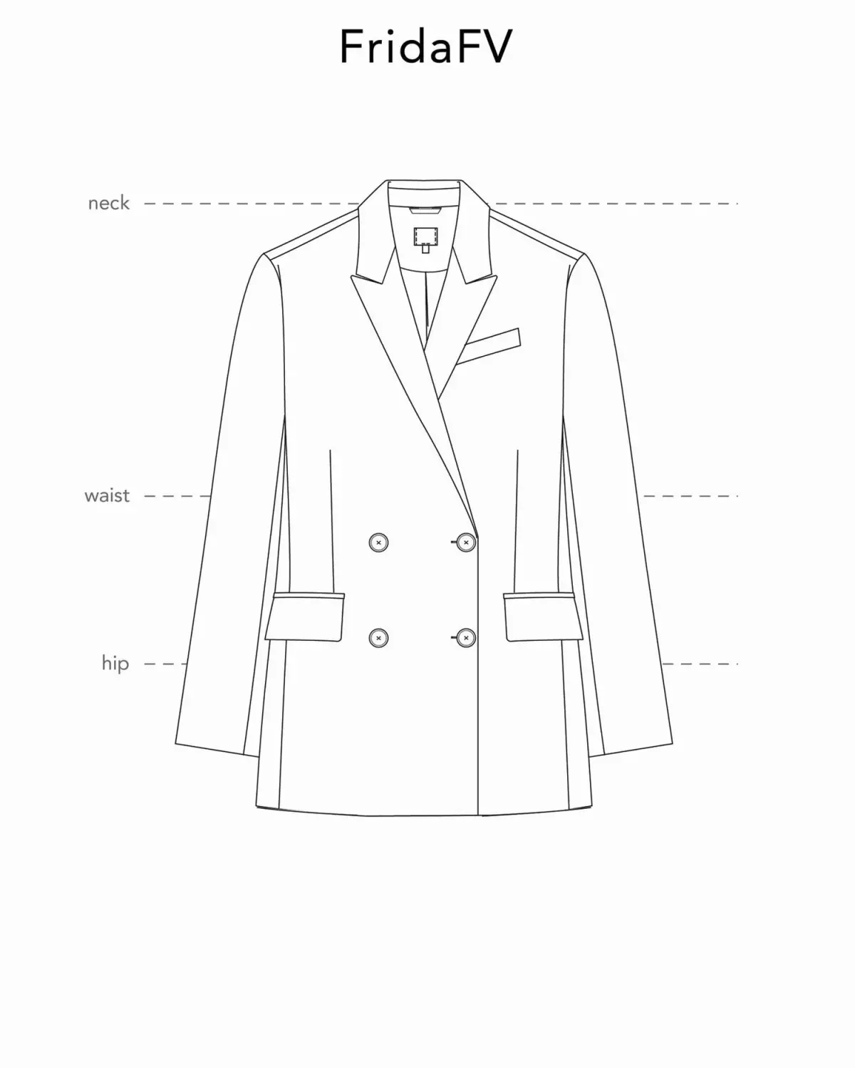 FridaFV blazer – en tidløs, dobbeltspent blazer med oversized passform som gir et moderne og elegant uttrykk. Jakken har spisse slag, myke skulderputer, funksjonelle klafflommer og dekorative logoknapper foran.