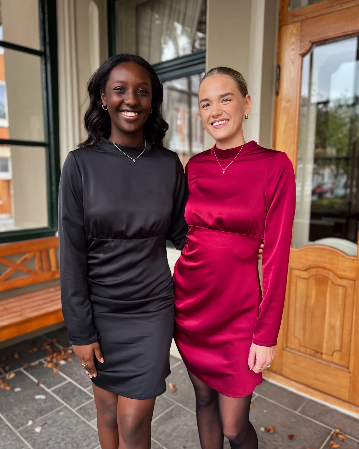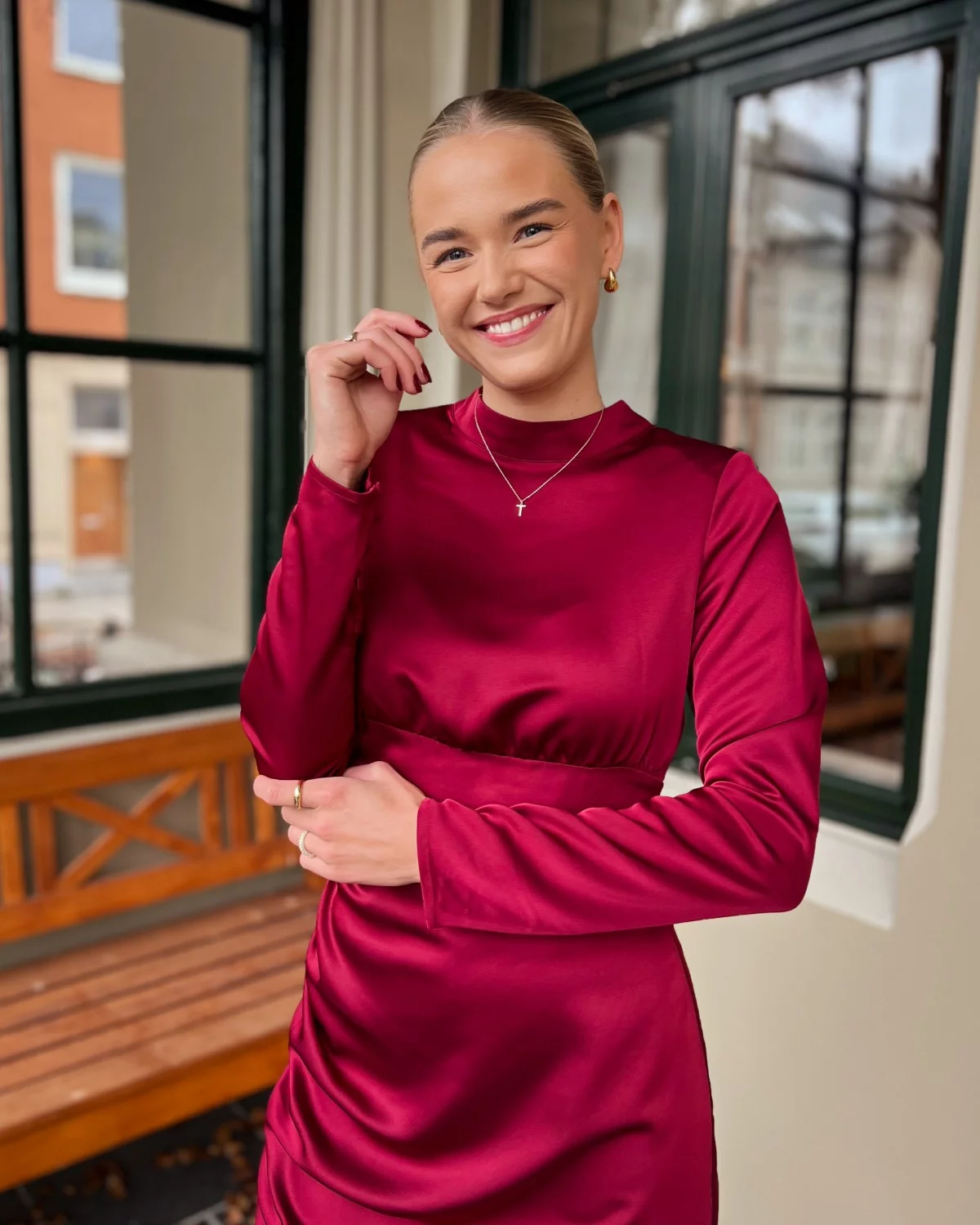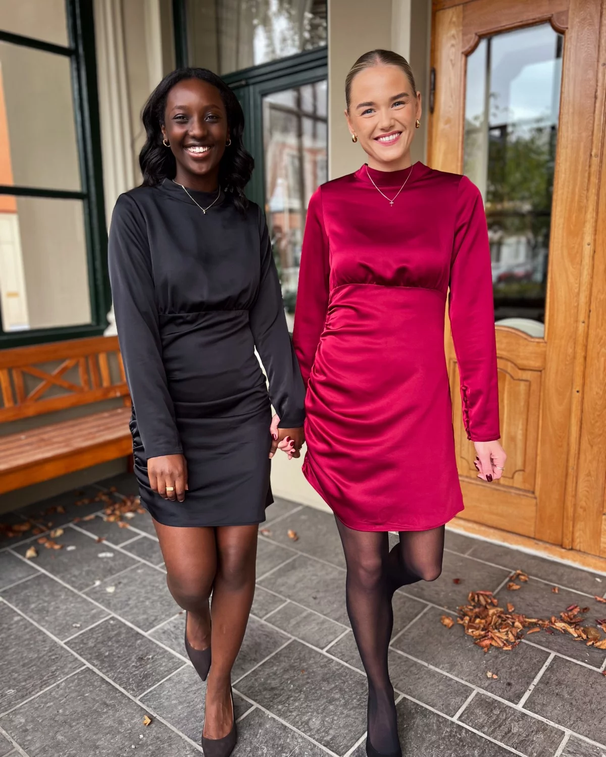 Isabel dress er en kjempefin kjole perfekt til fest og kveldsantrekk. Den har en elegant høy hals, flatterende lange ermer og kunstferdig rysjer som fører til en moderne asymmetrisk kant, noe som skaper en forlokkende silhuett.
