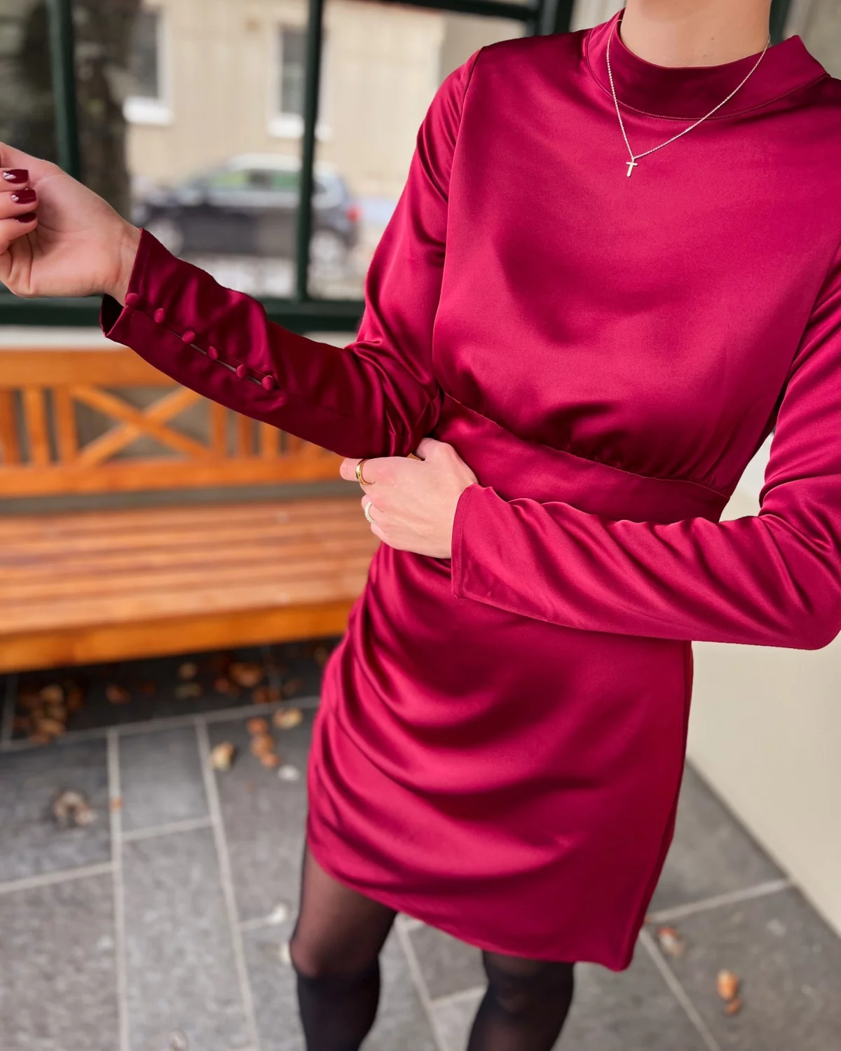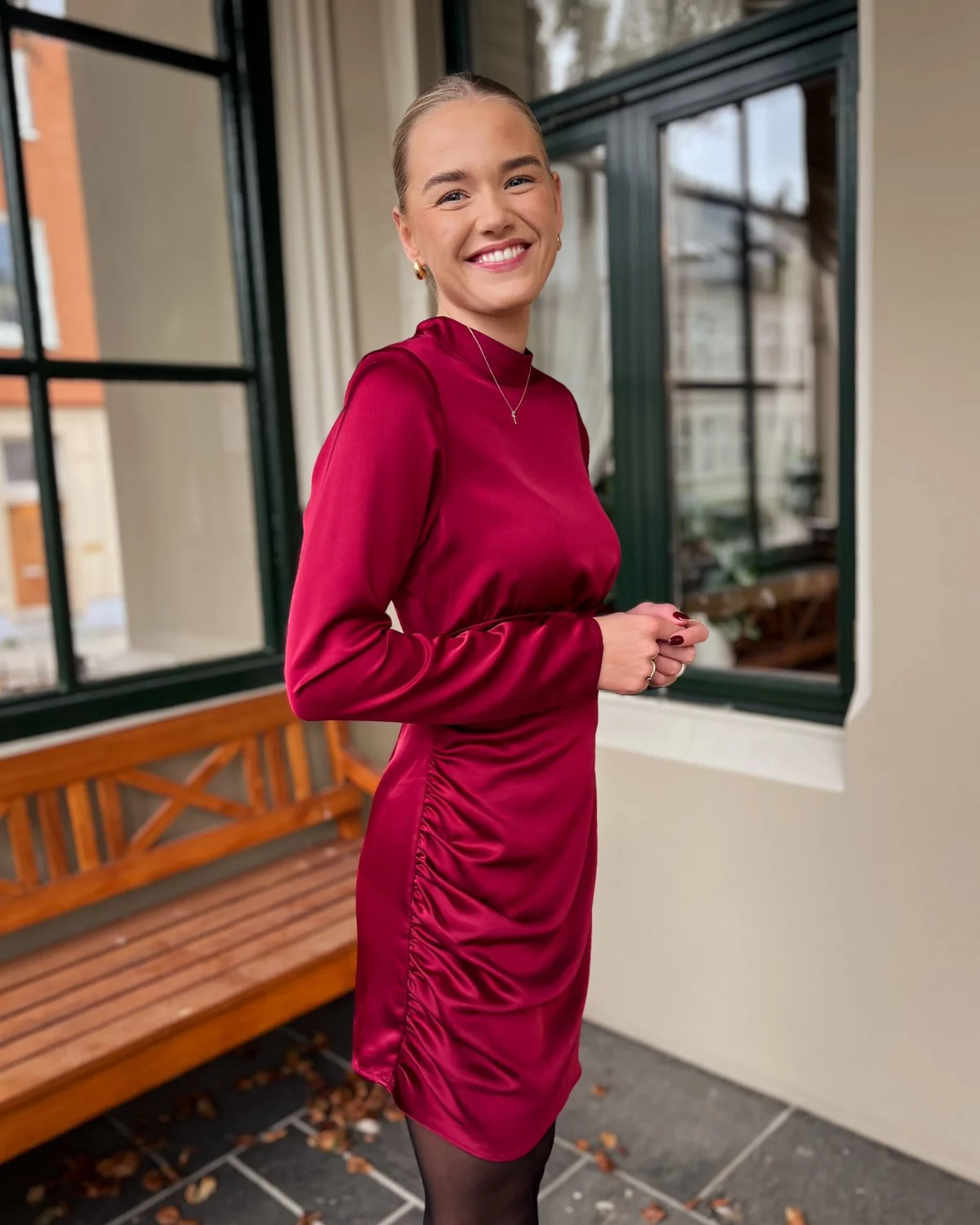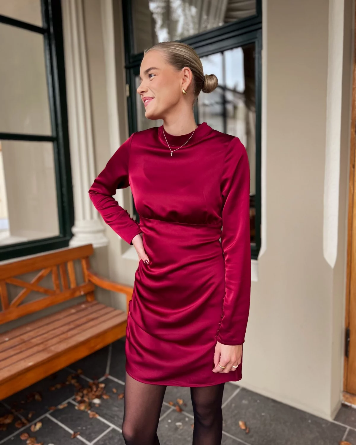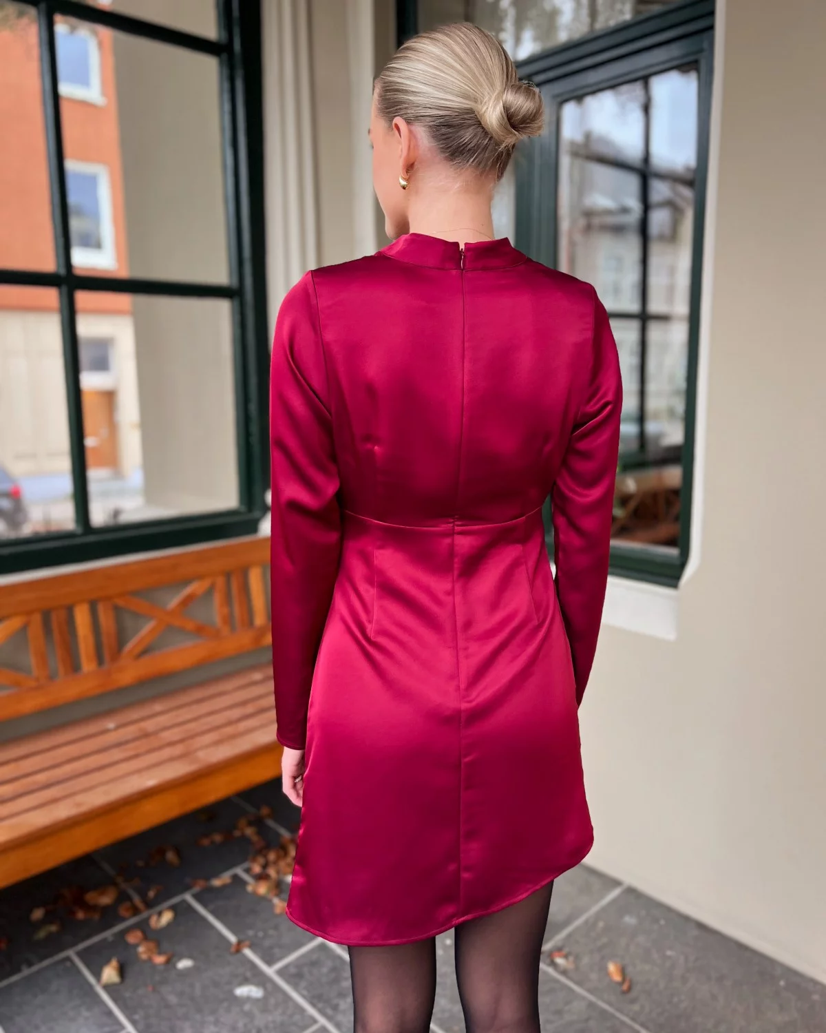 Isabel dress er en kjempefin kjole perfekt til fest og kveldsantrekk. Den har en elegant høy hals, flatterende lange ermer og kunstferdig rysjer som fører til en moderne asymmetrisk kant, noe som skaper en forlokkende silhuett.