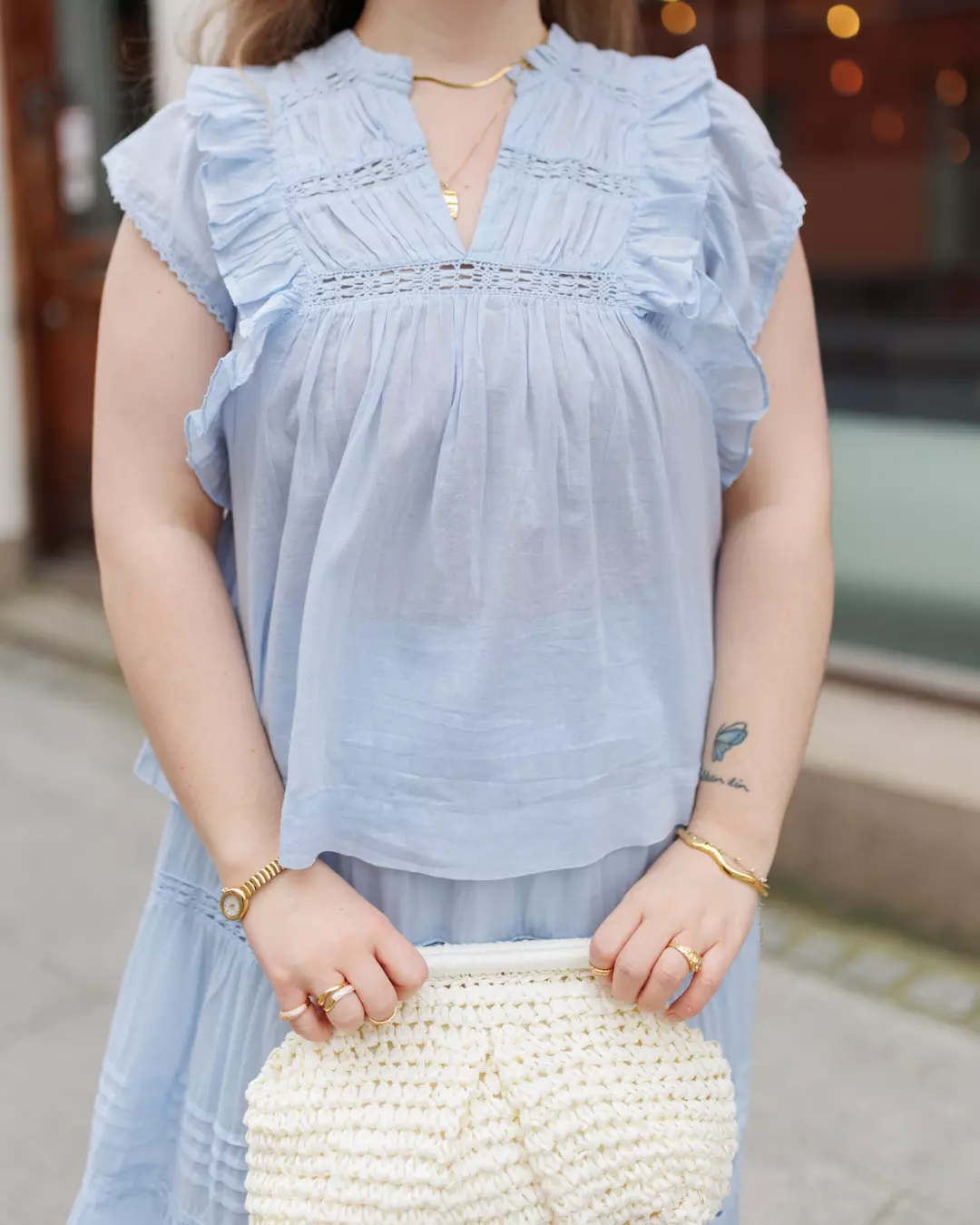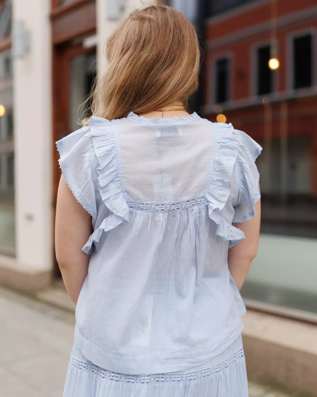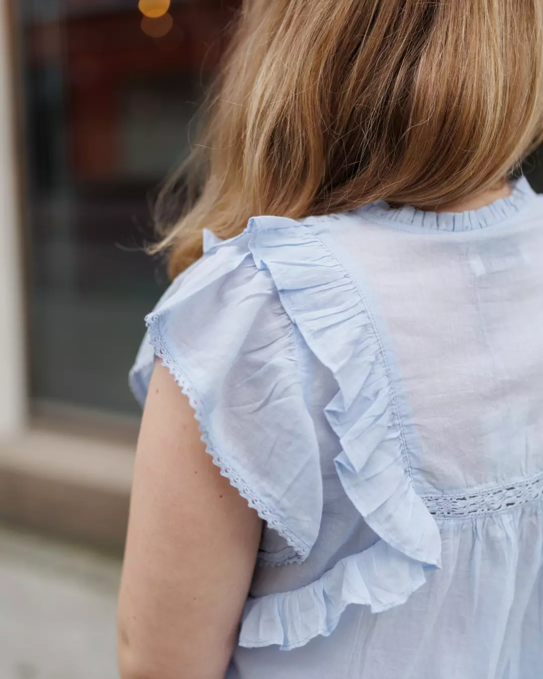 Jayla er en feminin ermeløs topp med flotte detaljer, med bånd og volanger. Toppen har en løs og komfortabel passform, men fortsatt smigrende