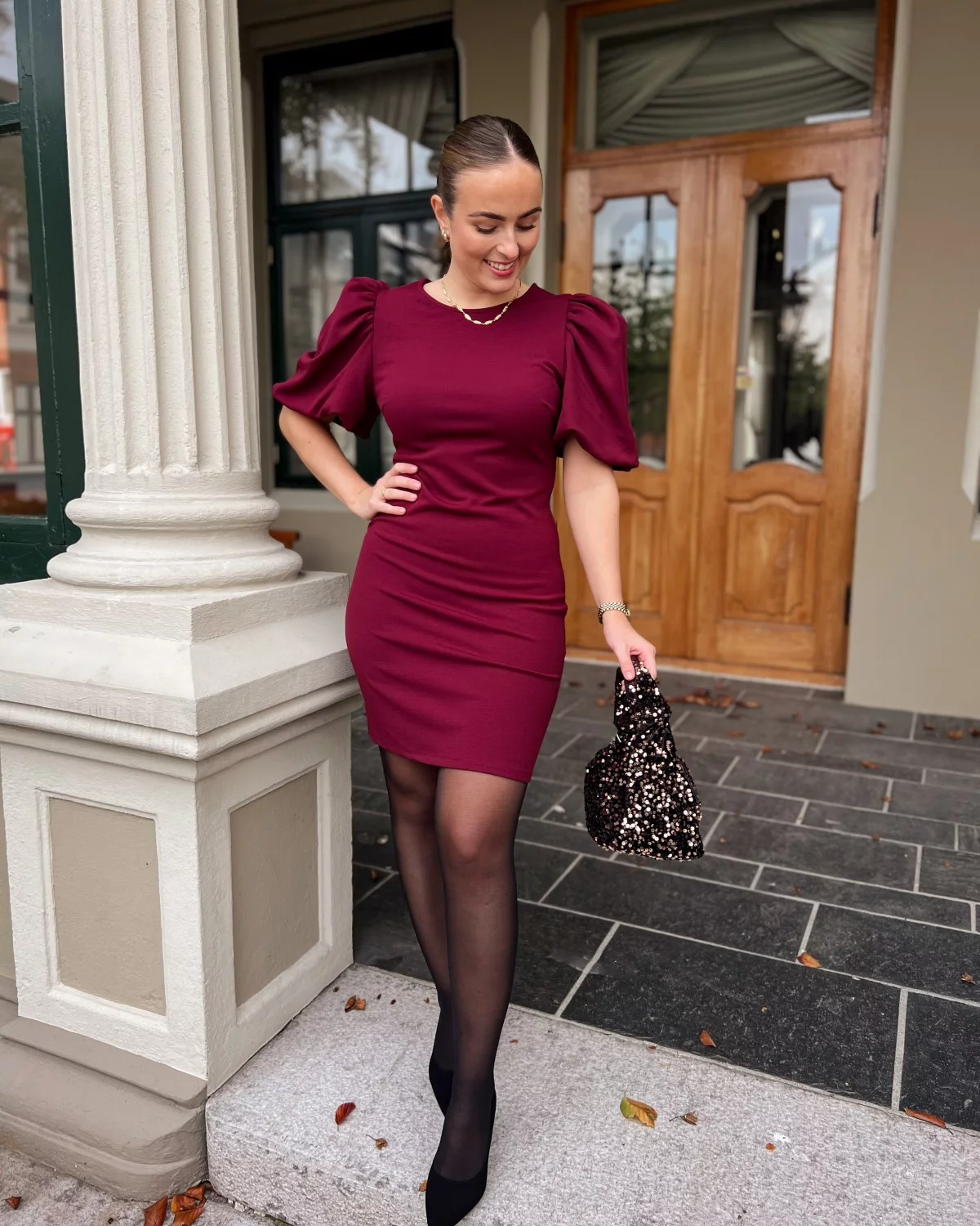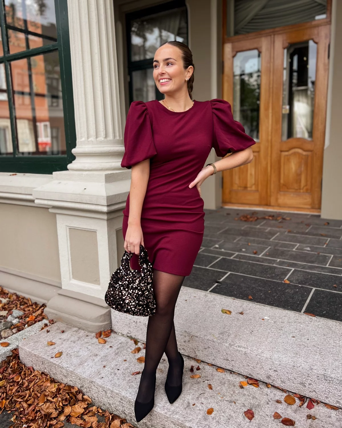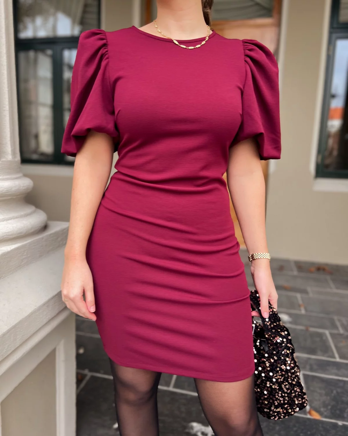 Denne stilige kjolen er perfekt for en kveld på byen eller en spesiell anledning. Den er laget av et mykt, elastisk stoff som vil få deg til å føle deg trygg og satt sammen. De oppblåste ermene tilfører et snev av femininitet og gjør at kjolen skiller seg ut fra mengden.