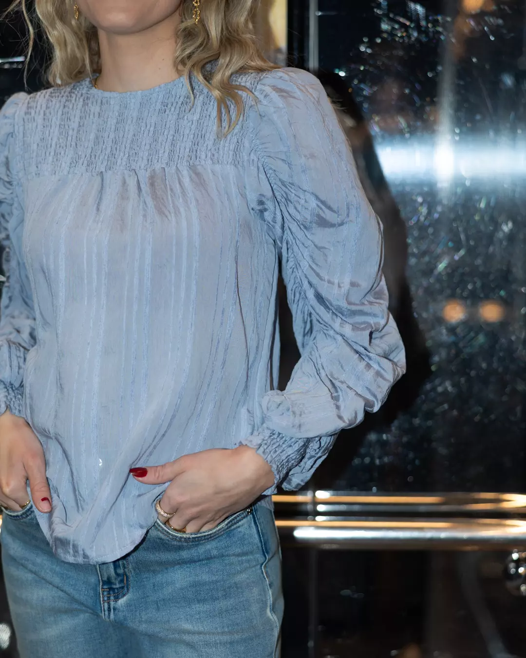 Lekker bluse fra Co’couture! Smock øverst og lekker detalj på ermene. Pseer perfekt til dressbusker og jeans.