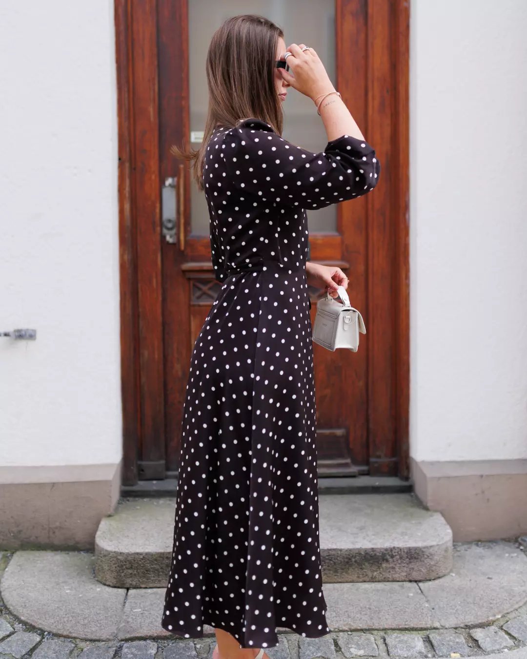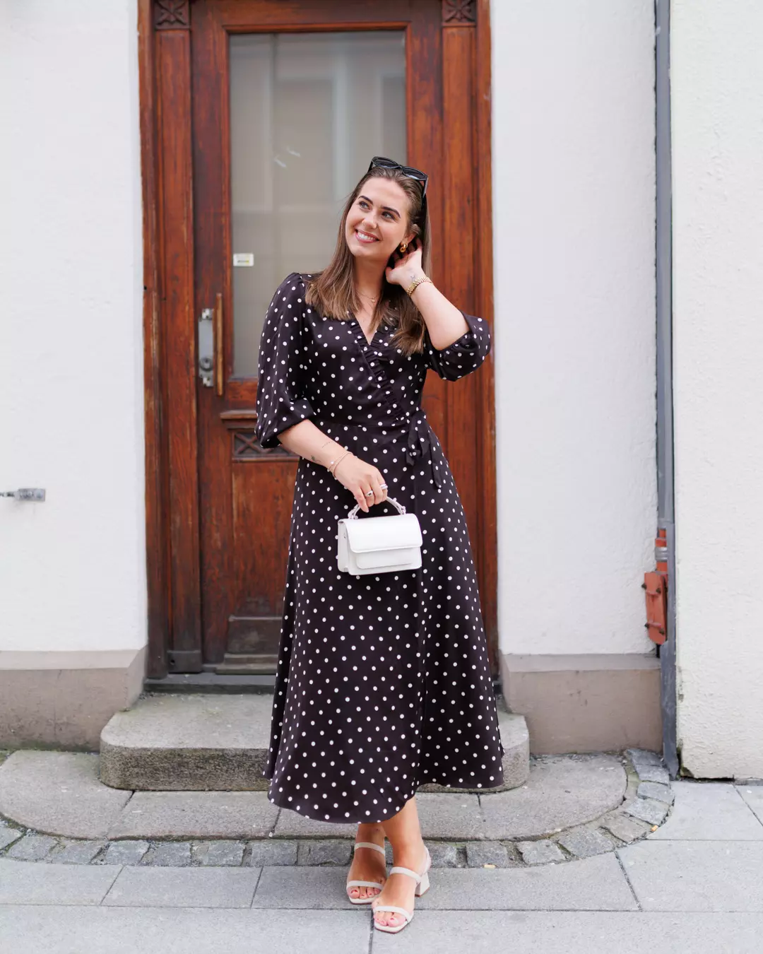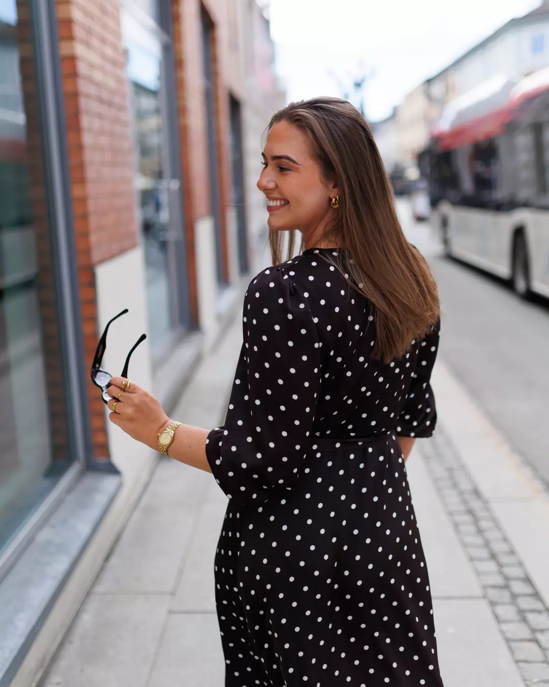 Midi lang kjole med innpakningslook og 34 ermer i prikkete trykk. Utringningen har elastikk som gir et drapert utseende. Modellen er 176 cm høy og har på seg størrelse 36.