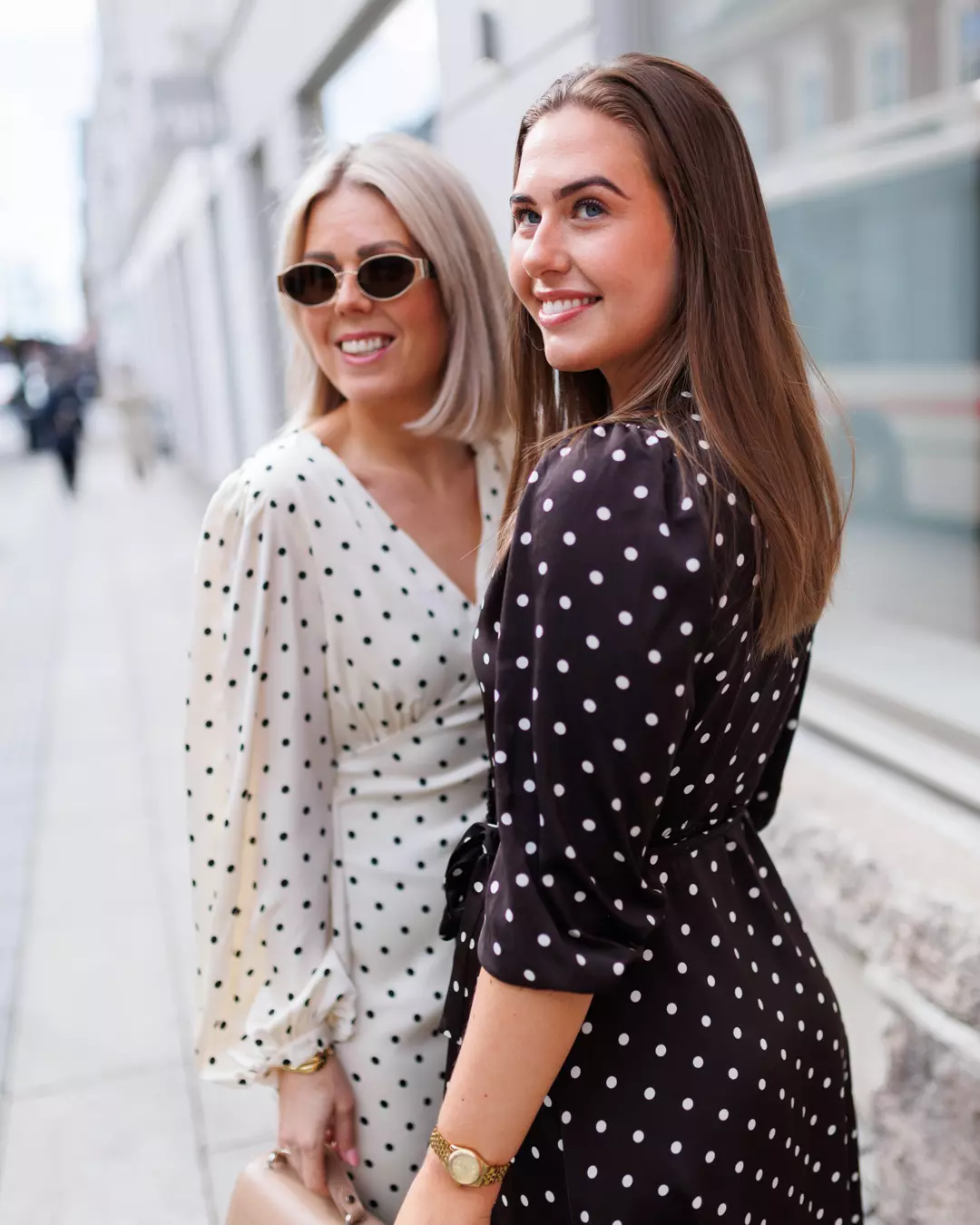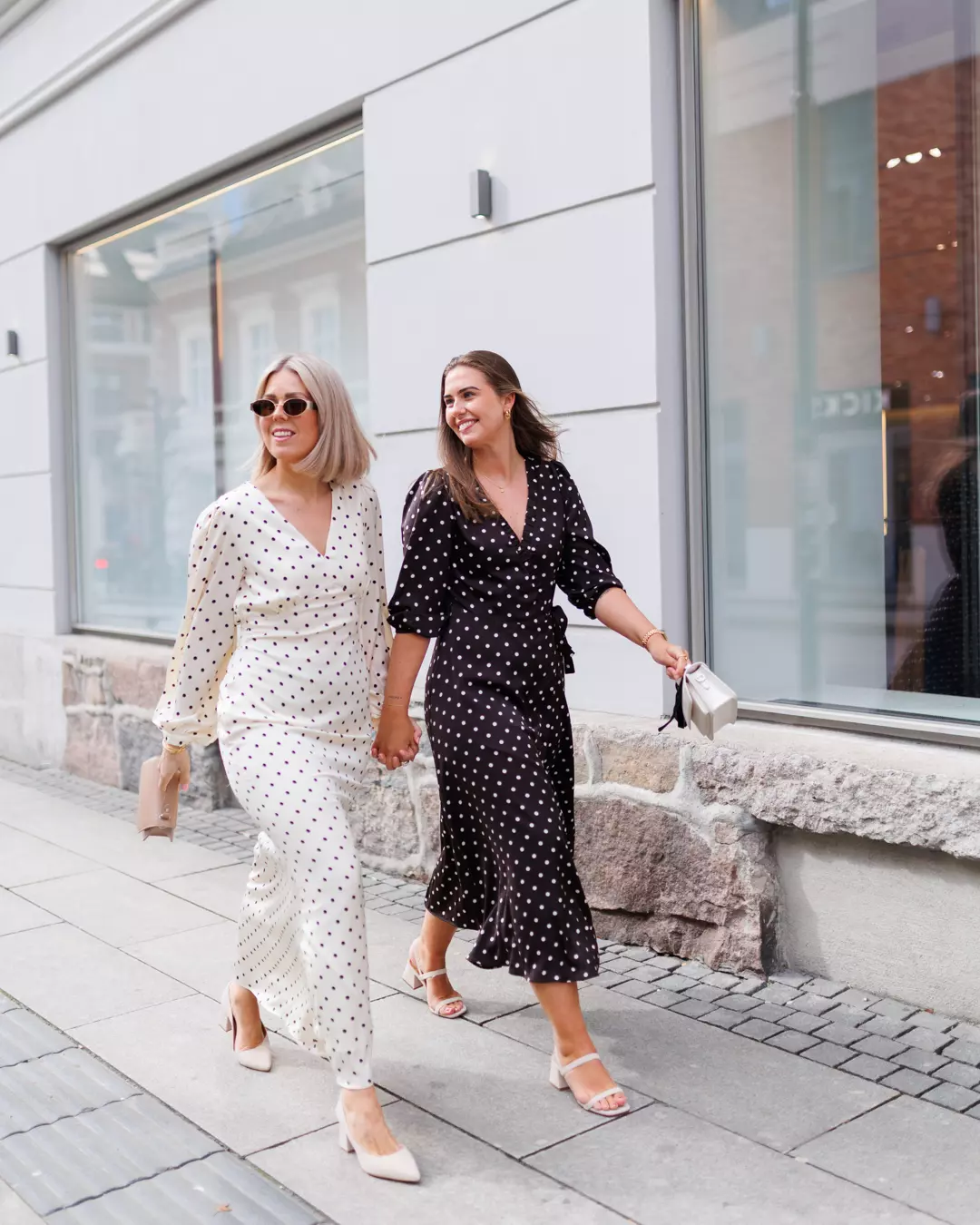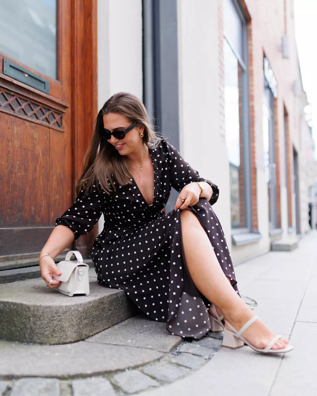 Midi lang kjole med innpakningslook og 34 ermer i prikkete trykk. Utringningen har elastikk som gir et drapert utseende. Modellen er 176 cm høy og har på seg størrelse 36.