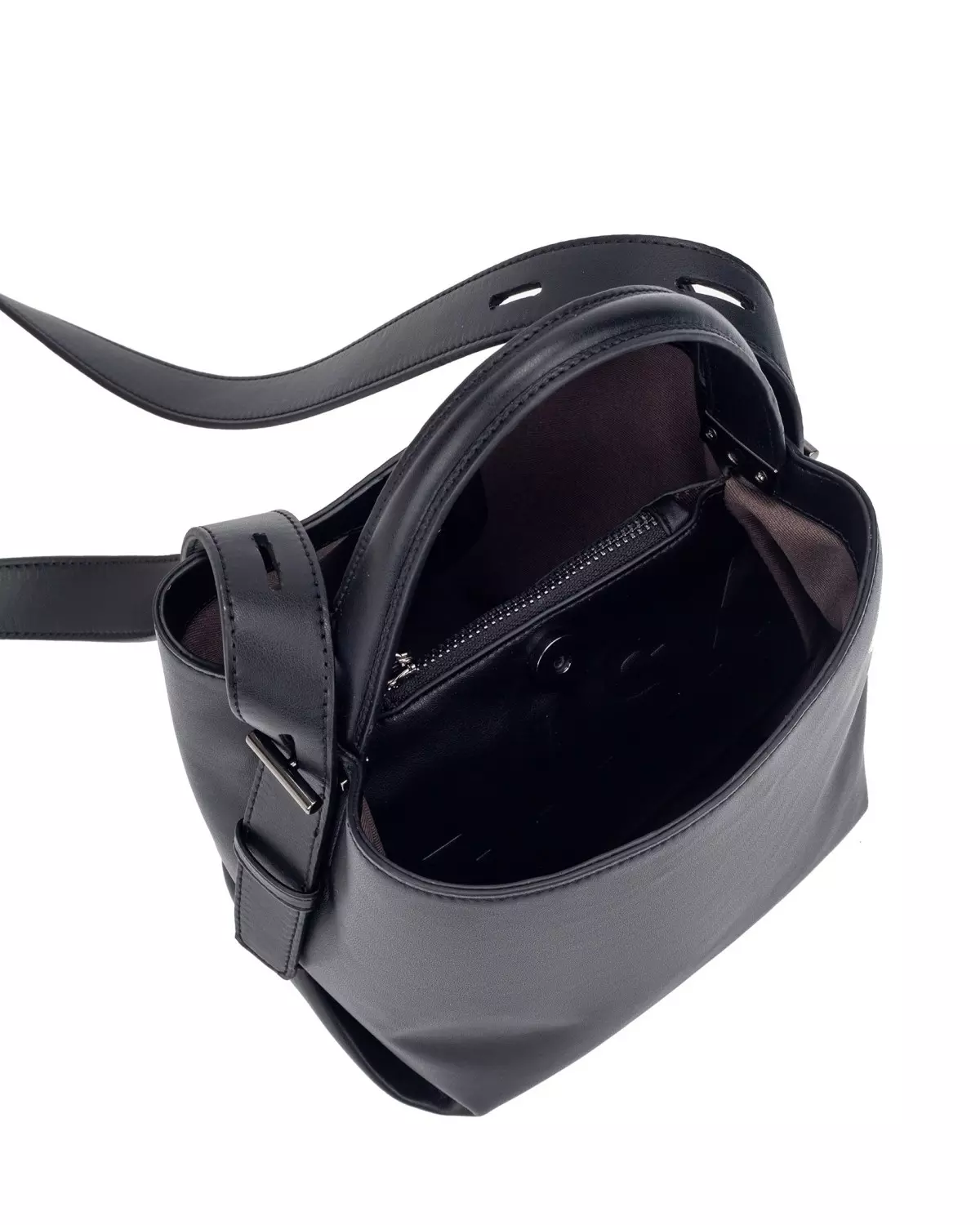 En stilren bucket bag med praktisk inndeling. Vesken har ett hovedrom og en innvendig glidelåslomme i midten som fungerer som en skillevegg, slik at du enkelt kan holde orden på det du har med deg.