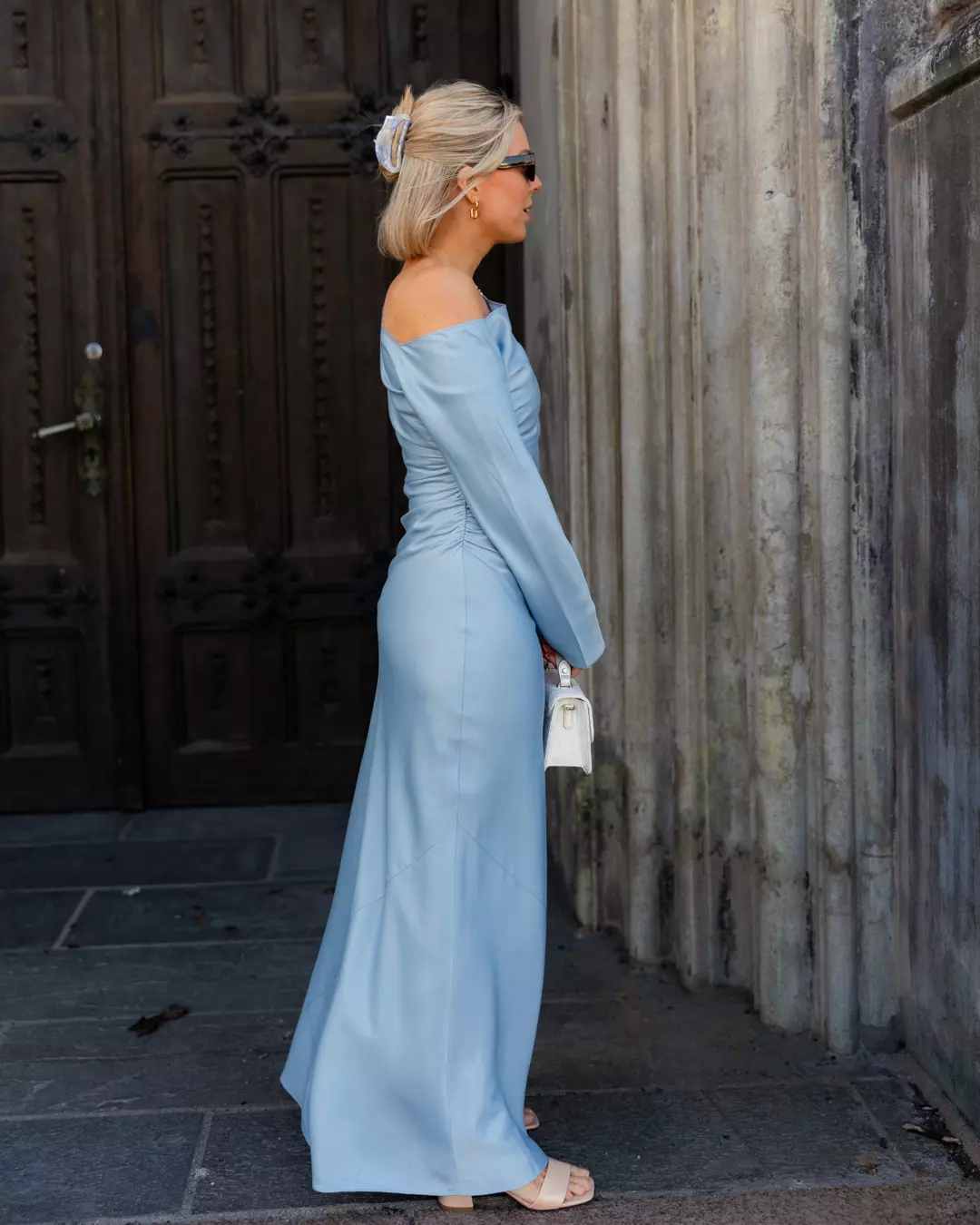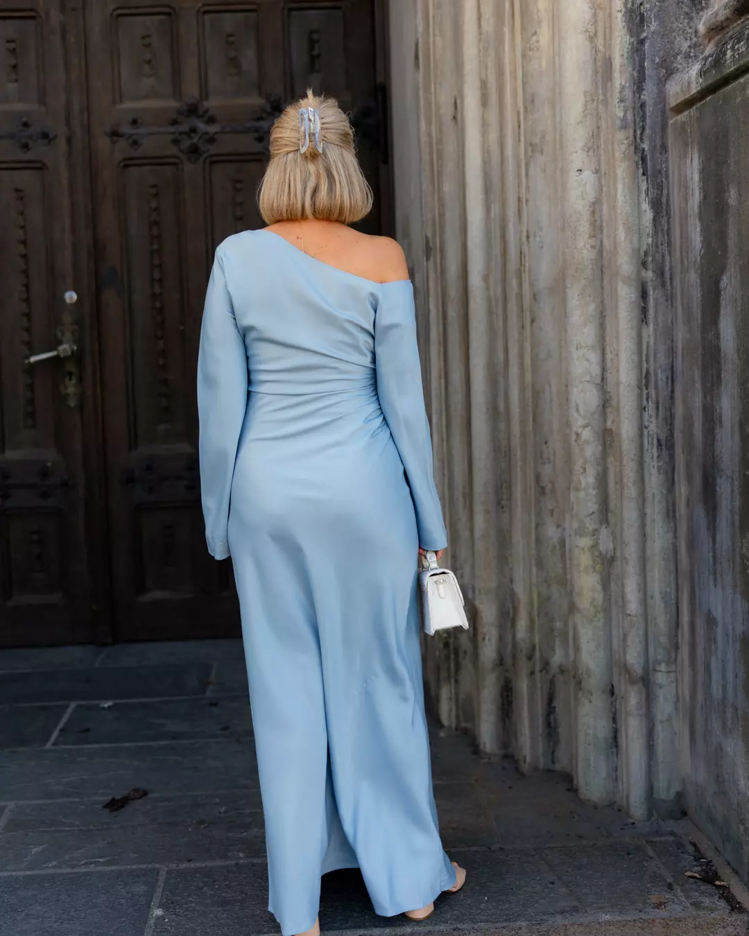 Montana Dress i nydelig grønnfarge, perfekt nå som våren kommer! Kjolen har en asymmetrisk lav skulderutringning, mykt rynkede detaljer i midjen og lange ermer.