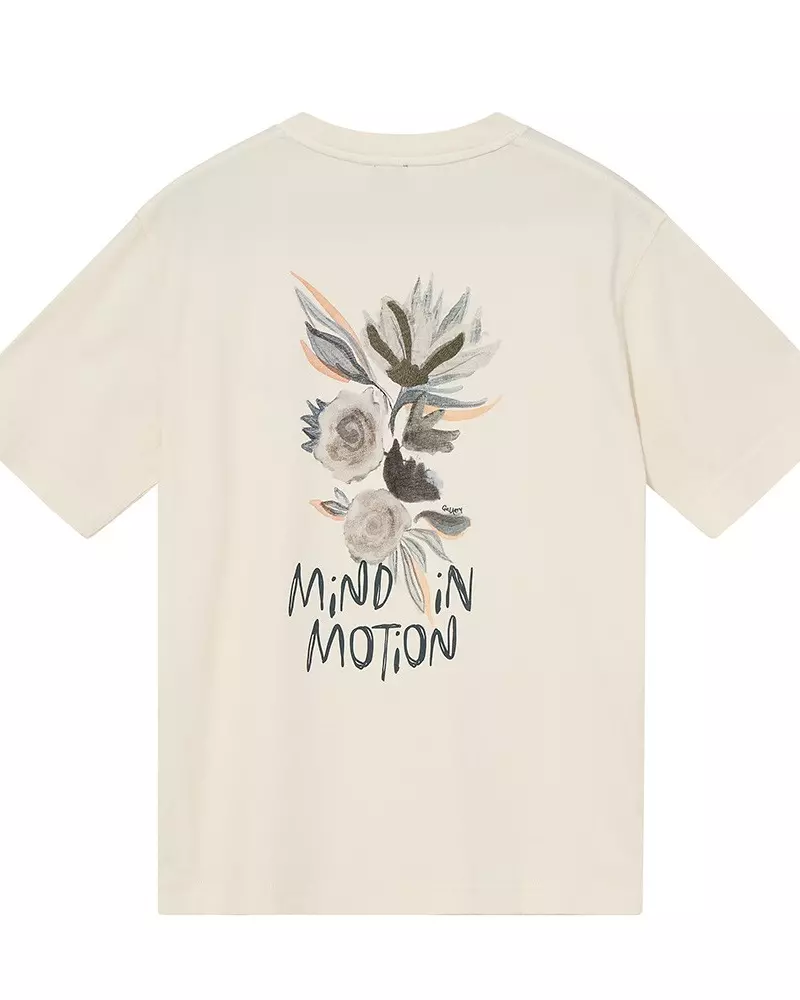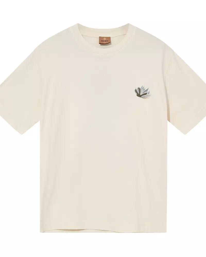 En tidløs, lett og behagelig t-skjorte i ecru som kombinerer en avslappet passform med kunstneriske detaljer. Den har rund hals og korte ermer, myk bomullskvalitet og et subtilt brodert emblem foran som møter et større grafisk motiv bak for et moderne, uttrykksfullt preg. Passer like godt alene med jeans som under jakke for en avslappet hverdagsstil.