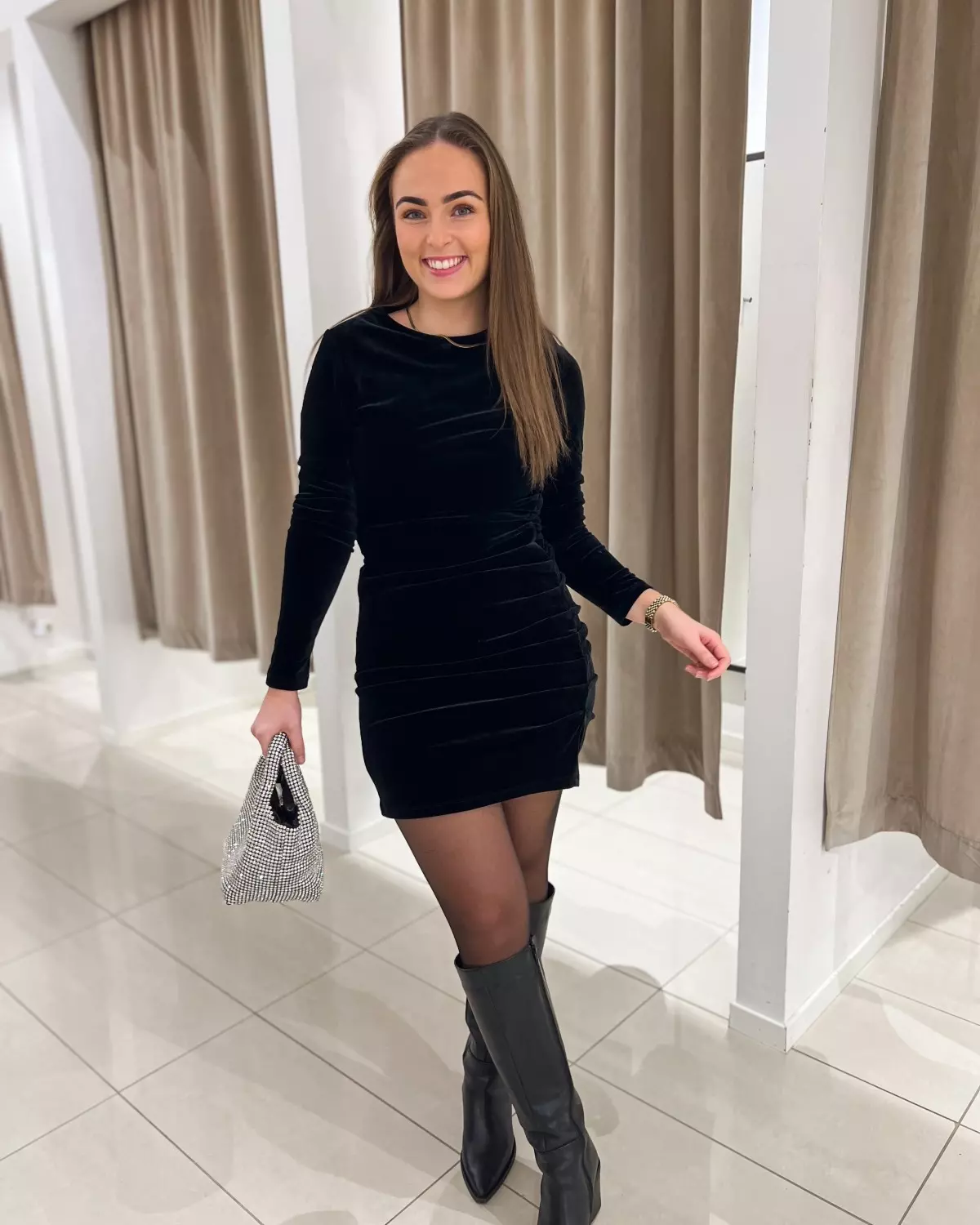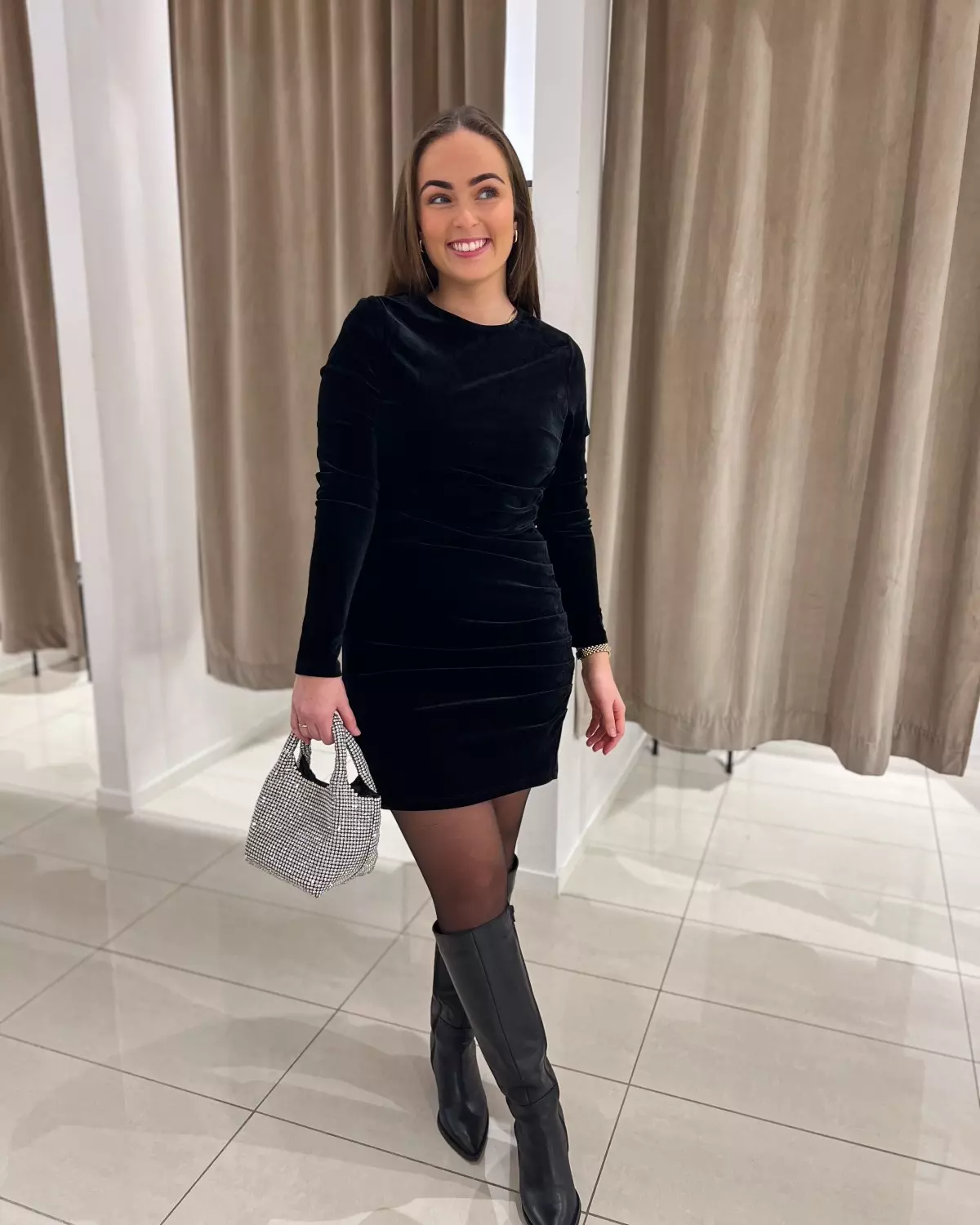 Nydelig velour kjole til partysesongen! Rund hals, lange ermer og en nydelig scrunch langs siden som gir en lekker fasong! Kommer også i en olivengrønn farge.
