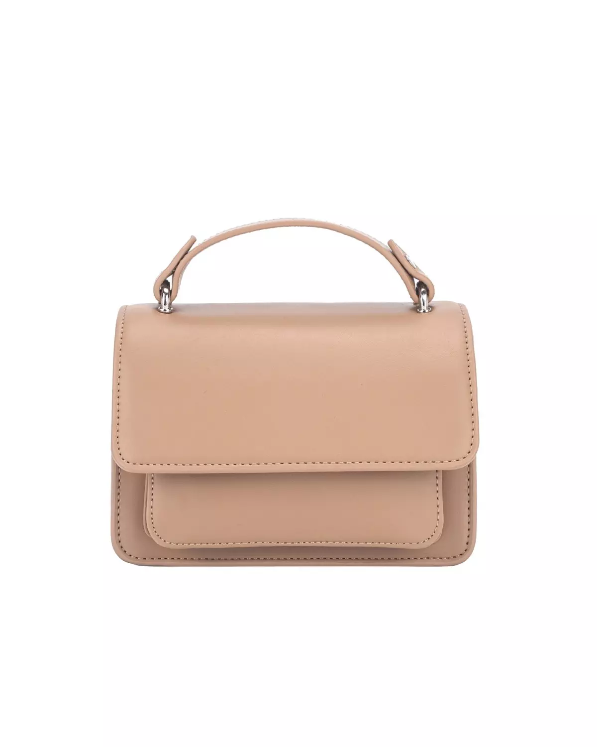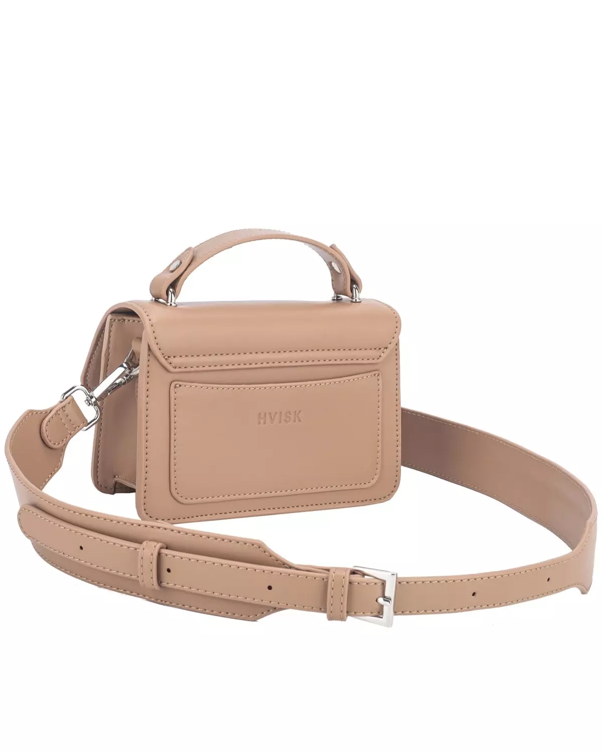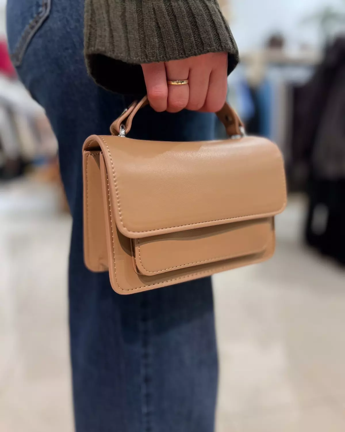 Miniveske med kort håndtak og avtakbar, justerbar skulderrem. Vesken har ett hovedrom og en frontlomme.