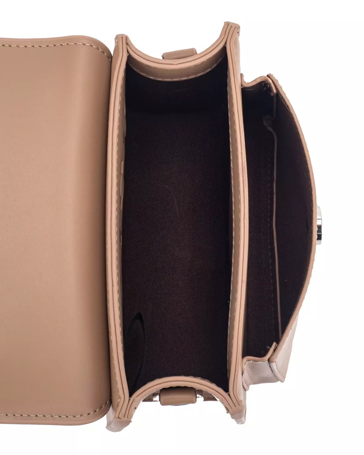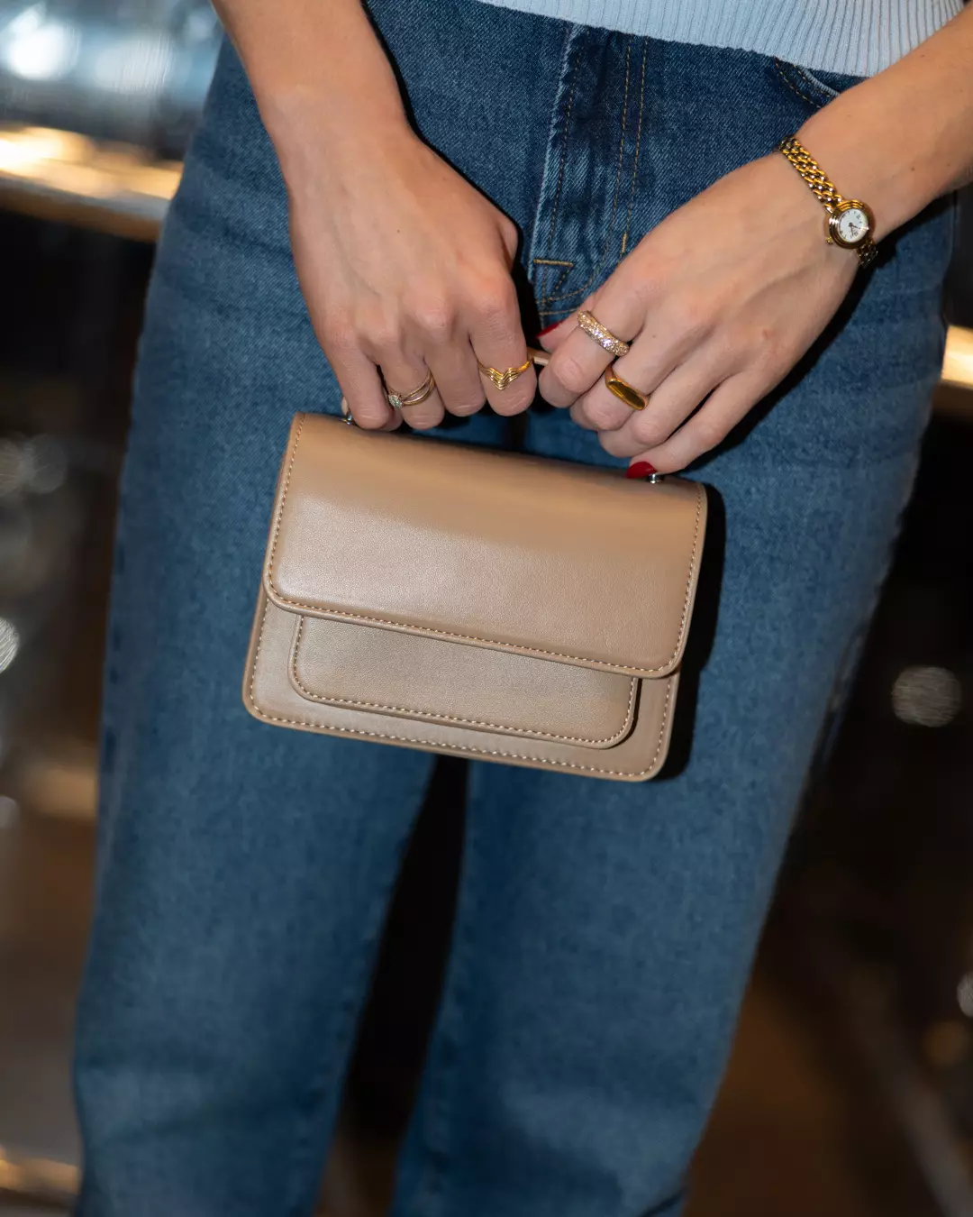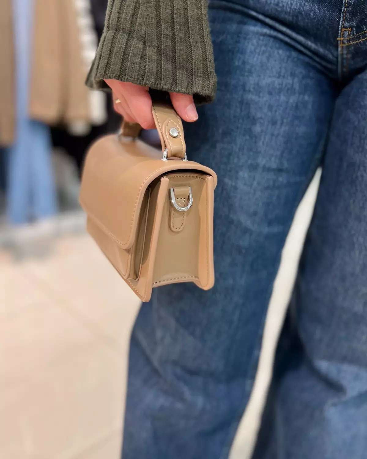 Miniveske med kort håndtak og avtakbar, justerbar skulderrem. Vesken har ett hovedrom og en frontlomme.