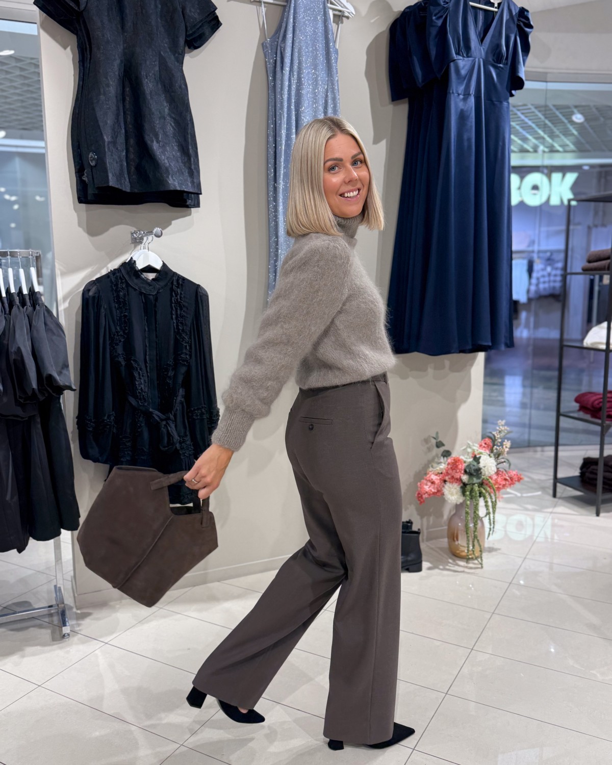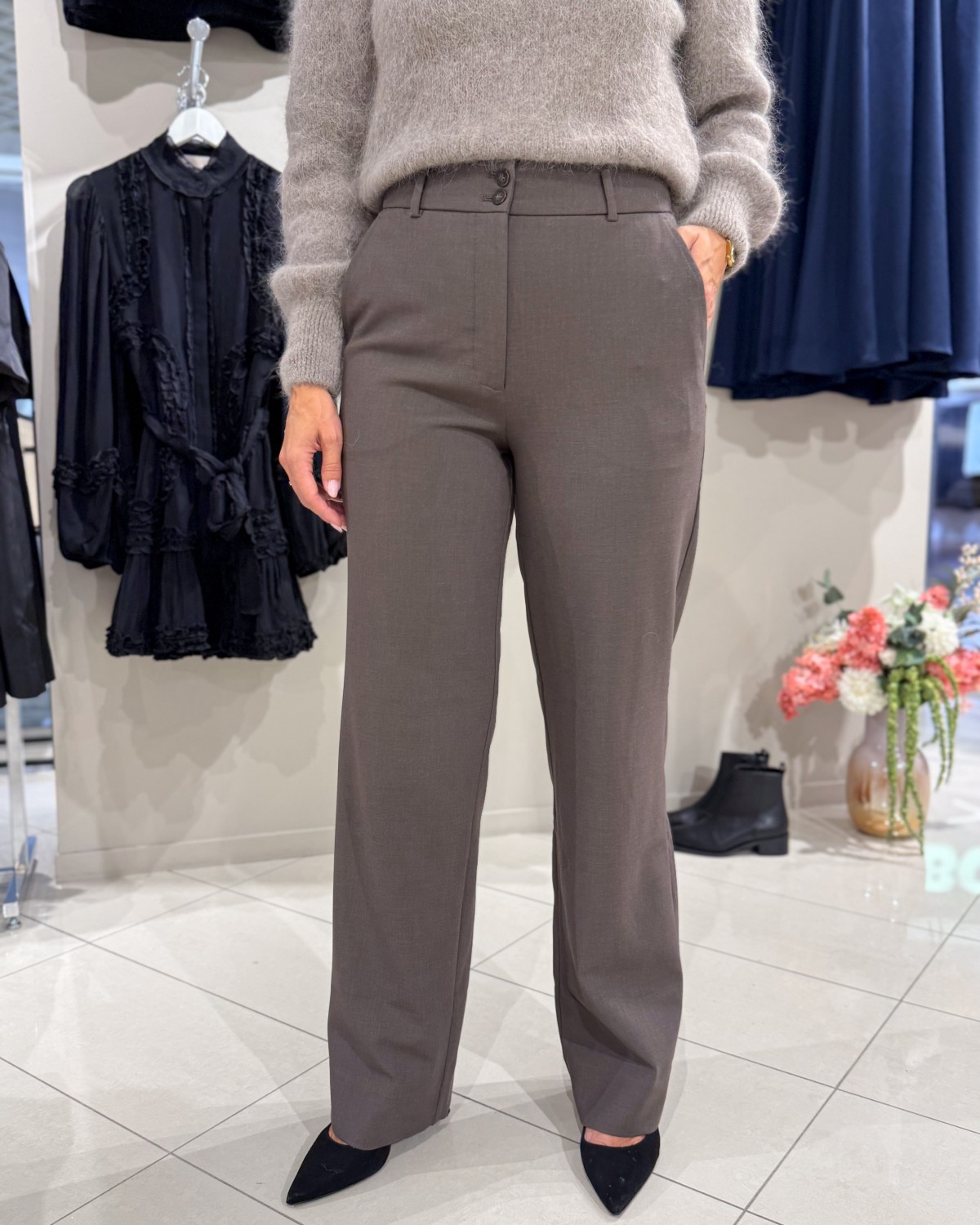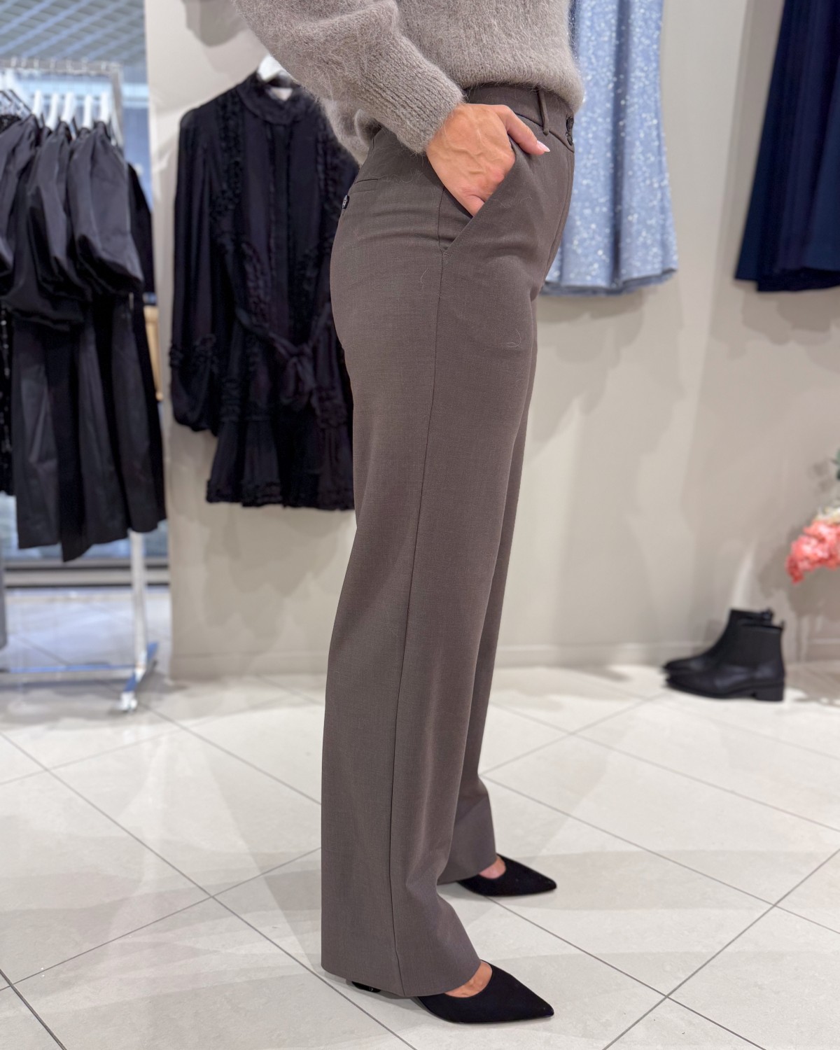 Buksen har en bred/rett passform og er høy i livet. Denne kommer i lengden Long, som er den lengste. Den kan enkelt pyntes opp med en pen bluse eller skjorte, ellers kan man gjøre den mer hverdagslig med en basic t-skjorte og en god strikk.