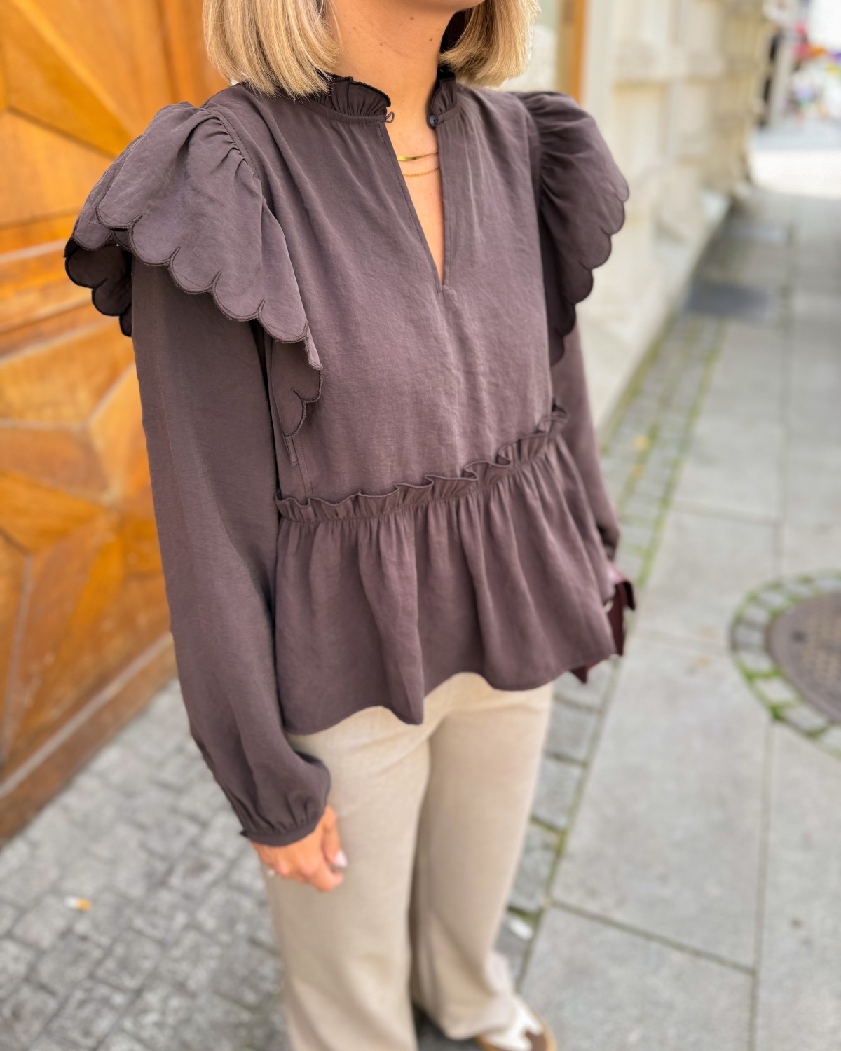Second Female bluse med volanger. Blusen er laget i en myk modal blanding. Den har V-hals og volangdetaljer ved nakke, skuldre og midje, og et ekstra lag i midjen for ekstra volum. Avslappet passform og en farge som passer til alt!