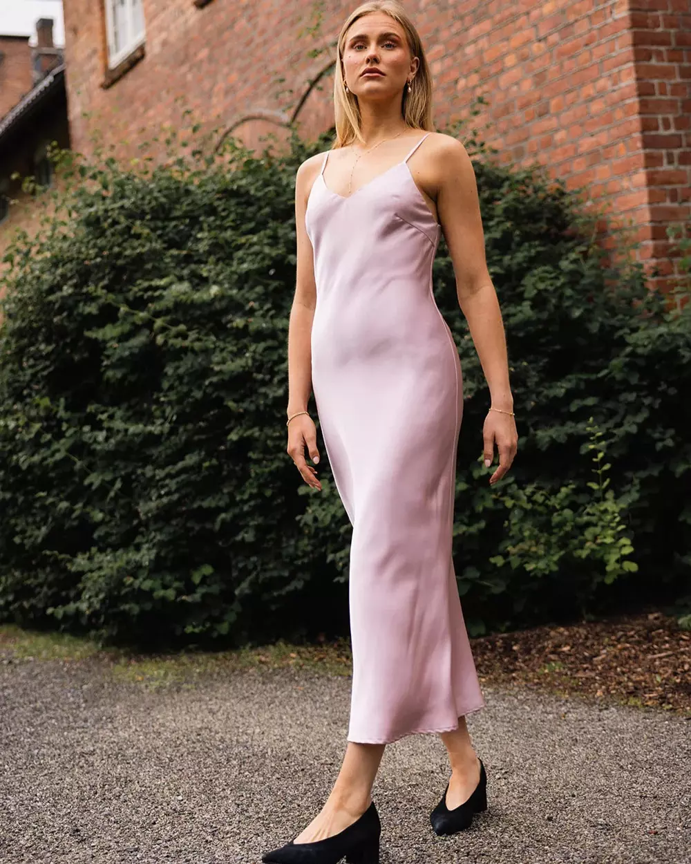 De tynne, justerbare spagettistroppene og det subtile v-utringningen gjør kjolen tidløs og anvendelig – perfekt til bryllup, sommerfester eller som en del av en kapselgarderobe.