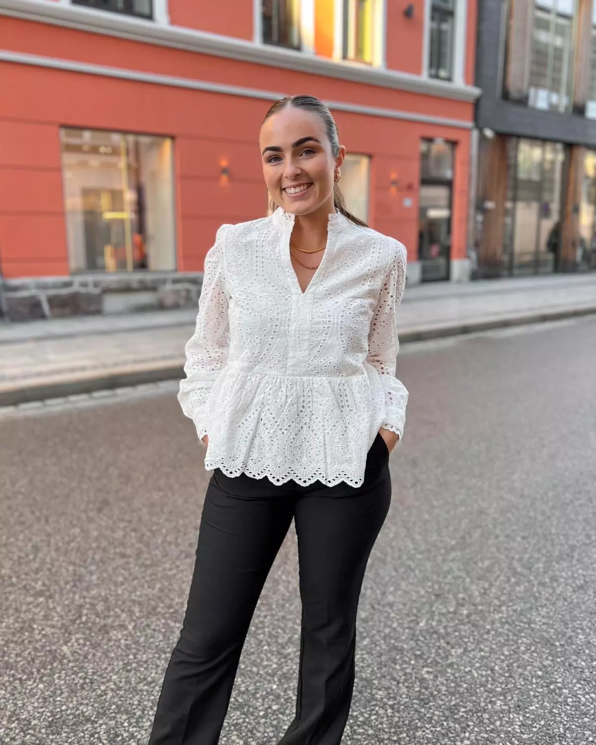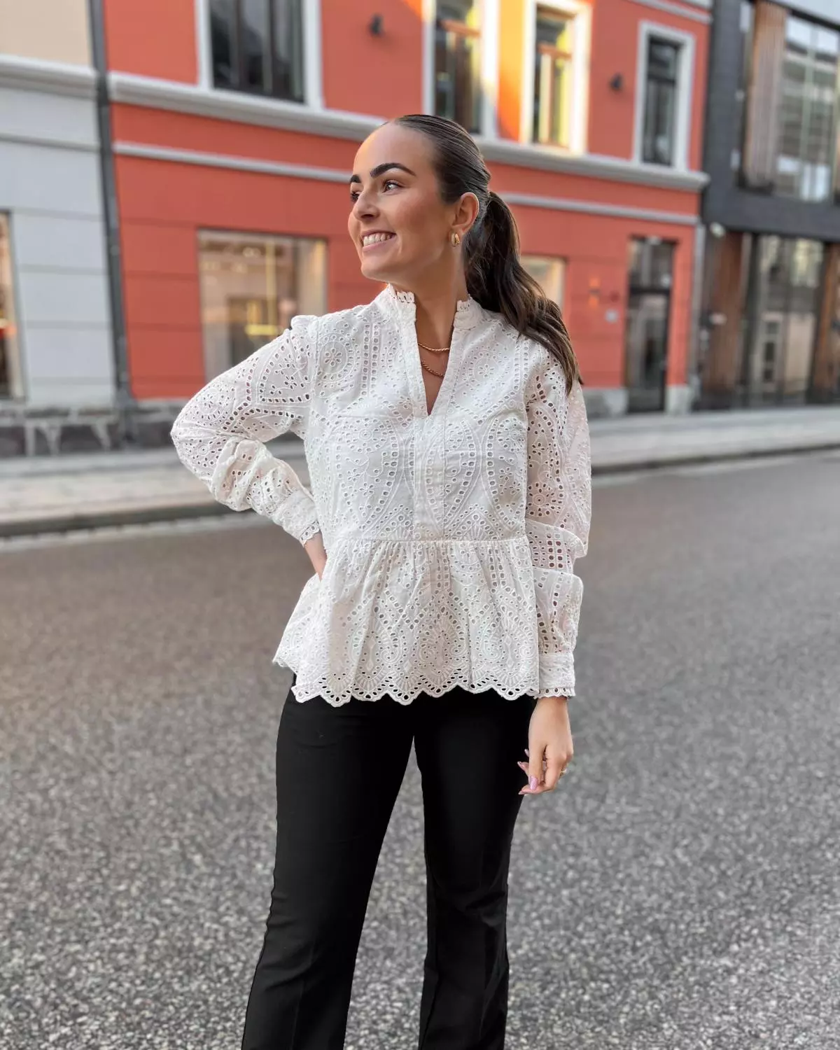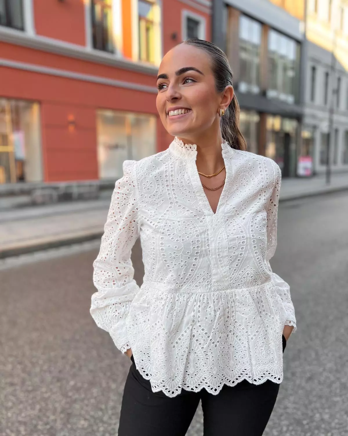 Toppen kommer i en nydelig crispy hvitfarge! Med V-hals, vakker brodering og mansjetter på ermene. Perfekt topp for vårsesongen!
