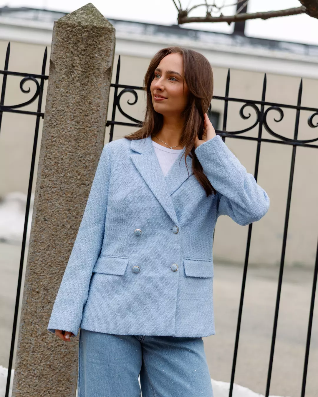 Nydelig tweedblazer fra danske YAS i den lekreste lyseblå fargen! Den har en litt oversized passform og fin krage. Knappene er i matchende blått stoff med gulldetaljer. Pynter opp vårantrekket! Den er også fin å belte i midjen for å skape en mer innsvinget feminin passform.