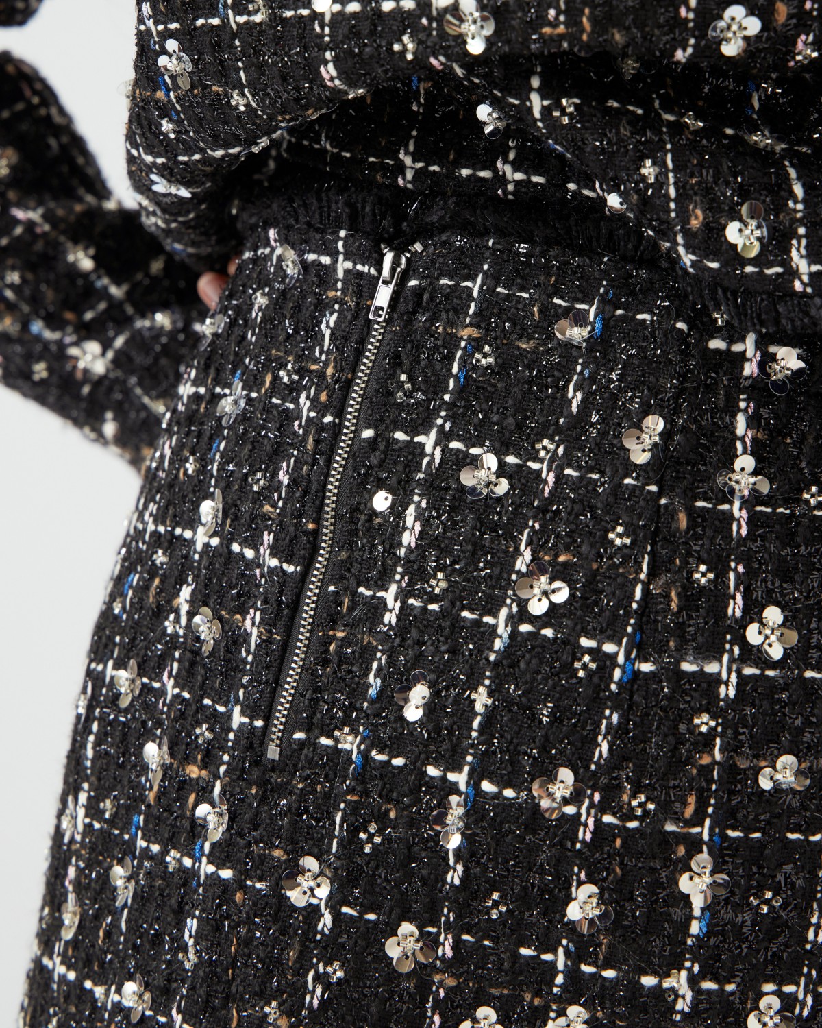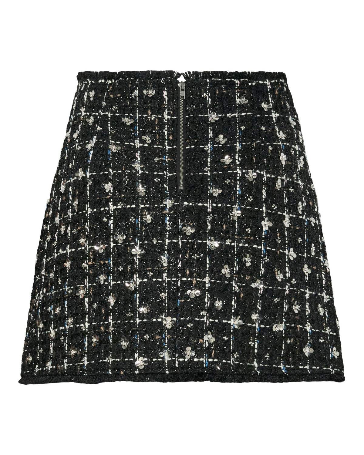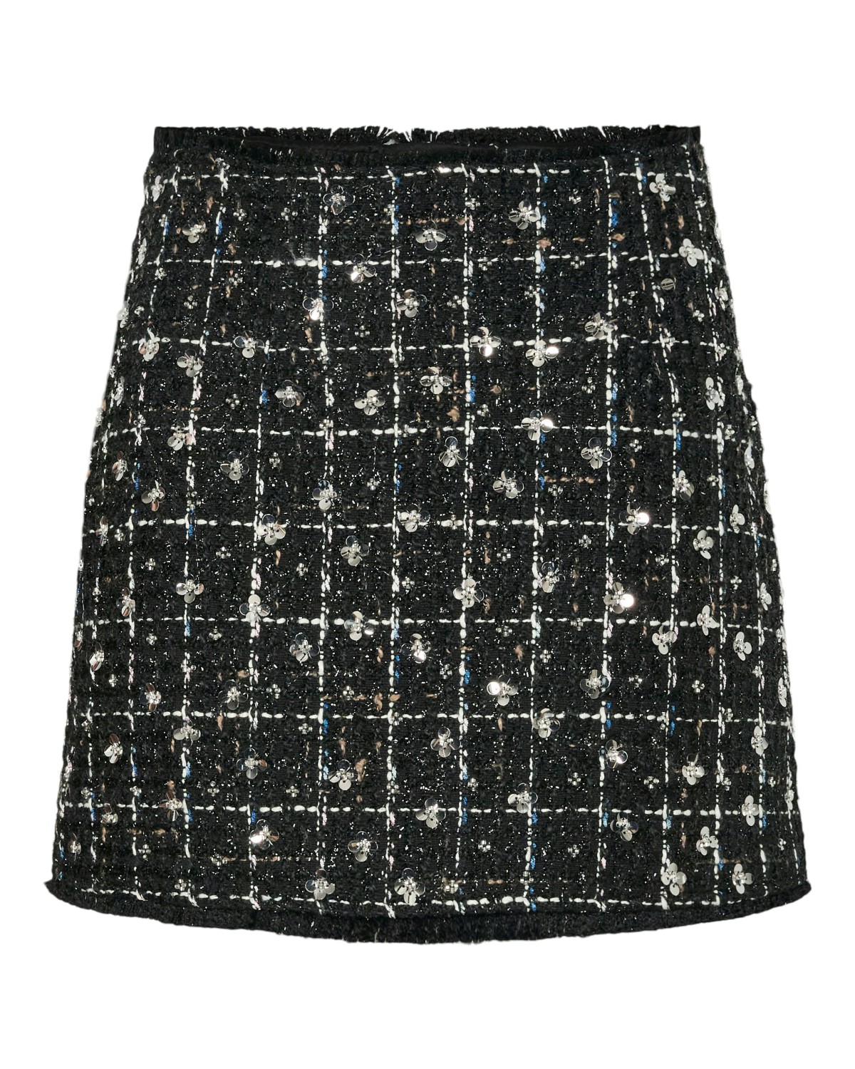 Det perfekte skjørtet til høst og kommenede festsesong! Rutete tweed mønster med glitter og paljetter som gir det lille ekstra. Frynser i endene. Den er fin å style med en sort fest top.