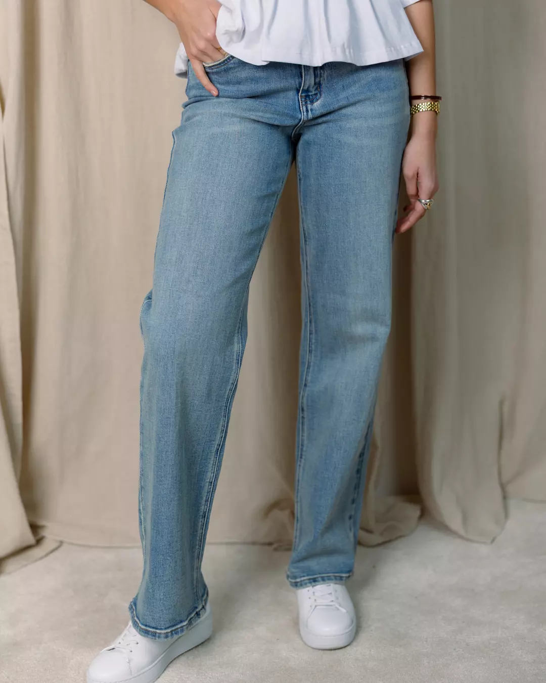 Disse jeans er store i størrelsen. Vi anbefaler å gå ned én størrelse. Modell med hvit overde har strs 25/32 og er 170 cm