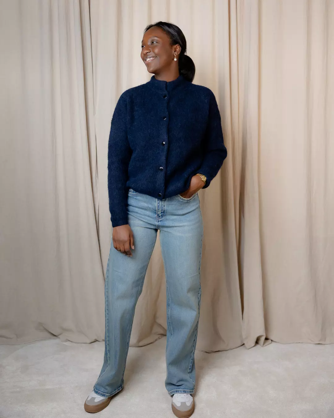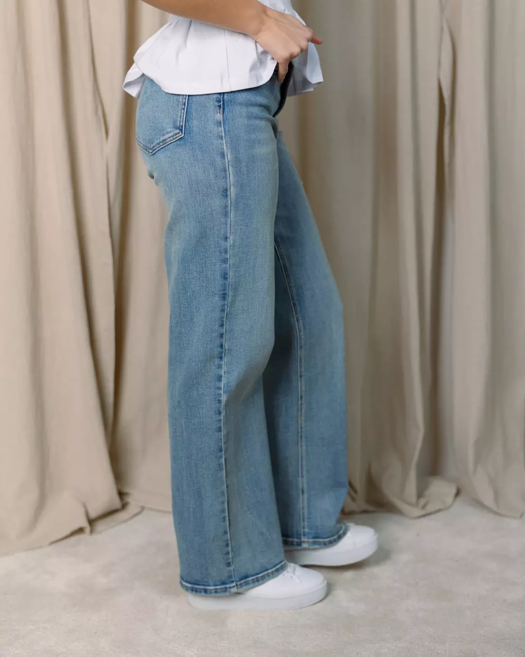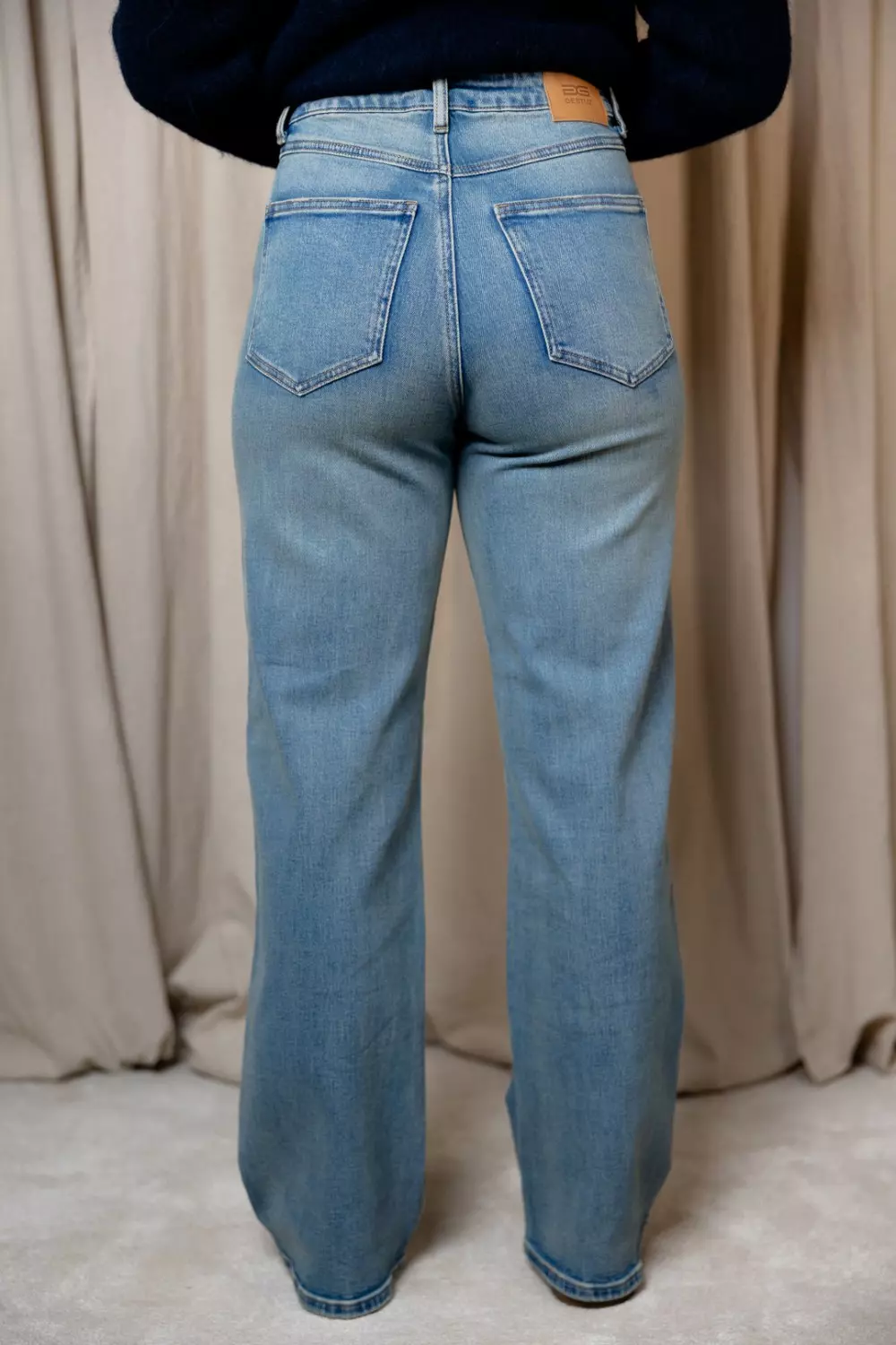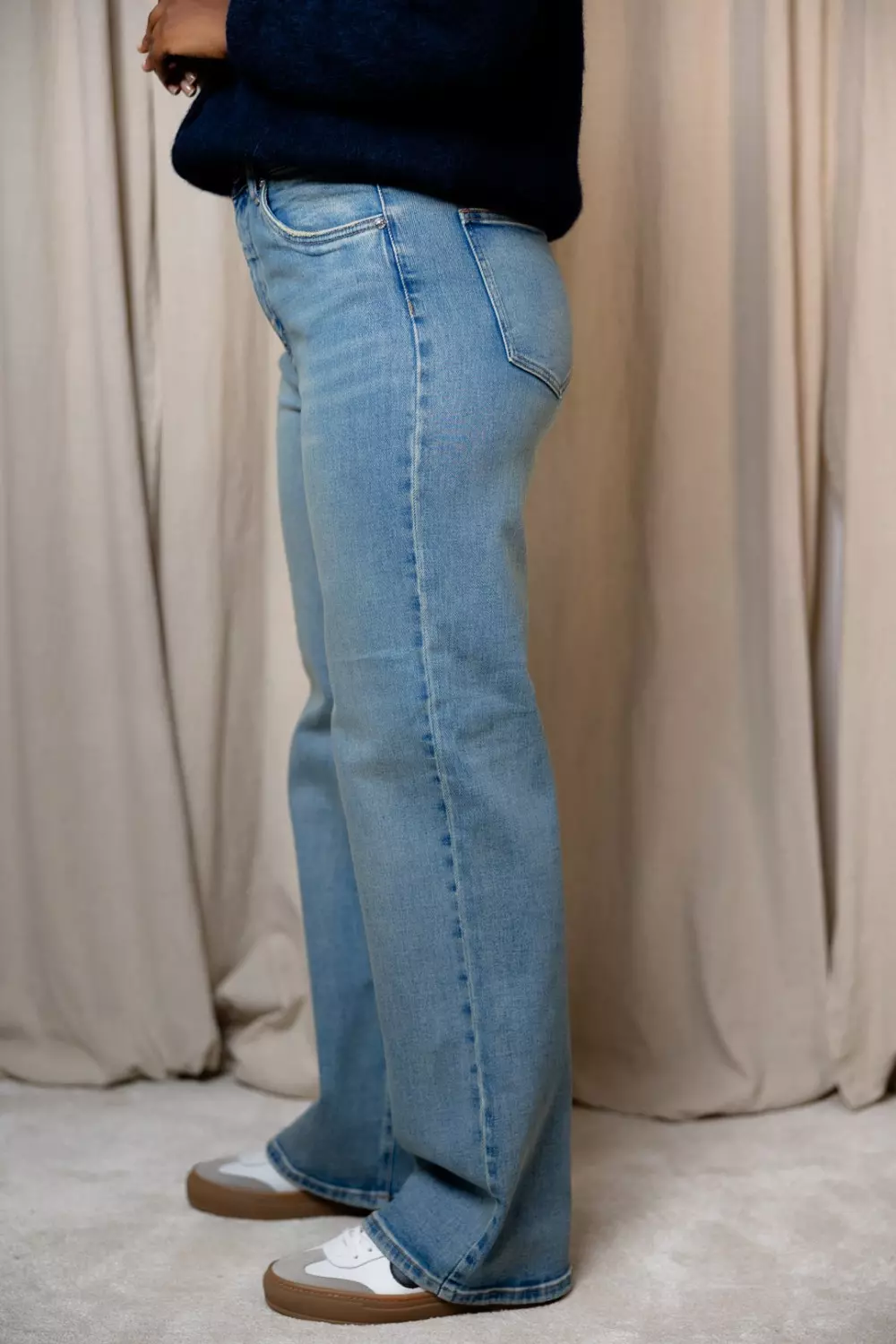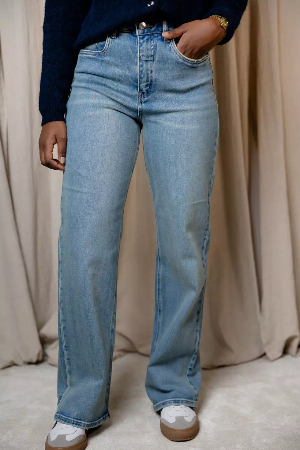 Zolani Wide leg jeans med rett, løstsittende silhuett, høy midje og klassisk fem-lommers design. Synlig struktur i denim og sikker knappelukking.